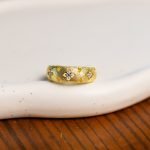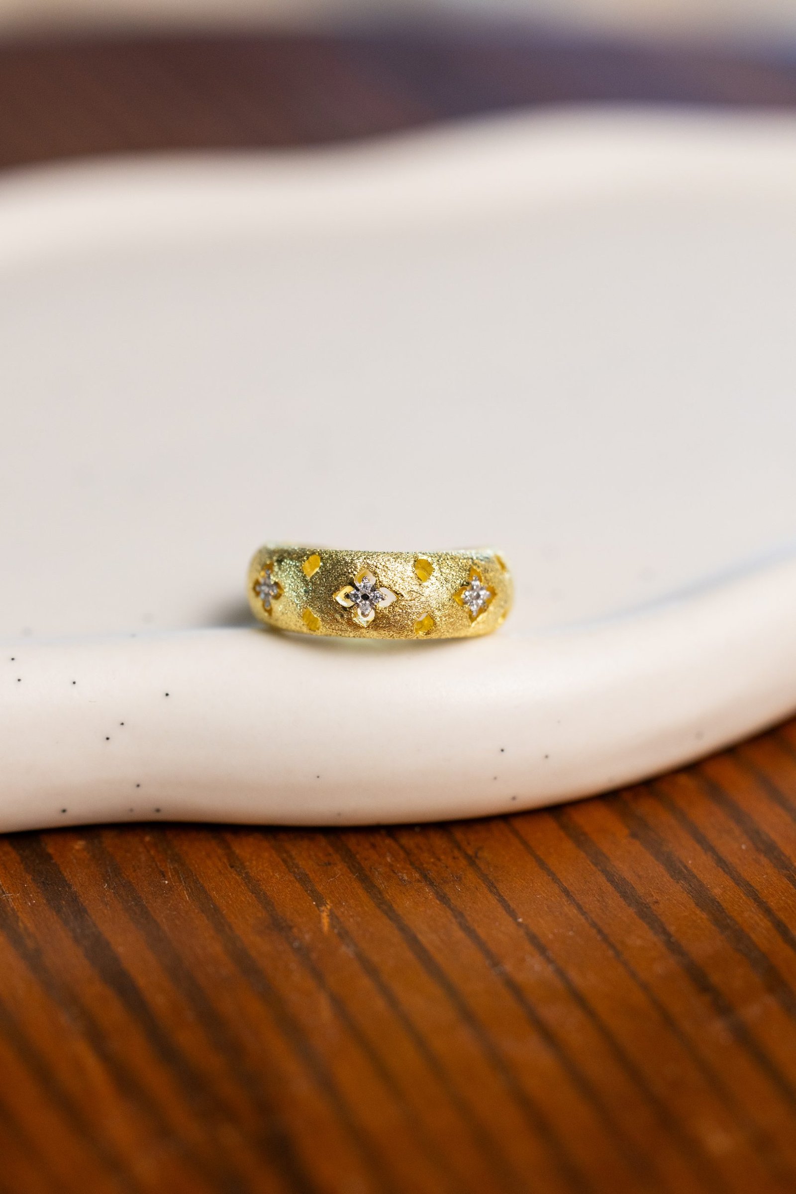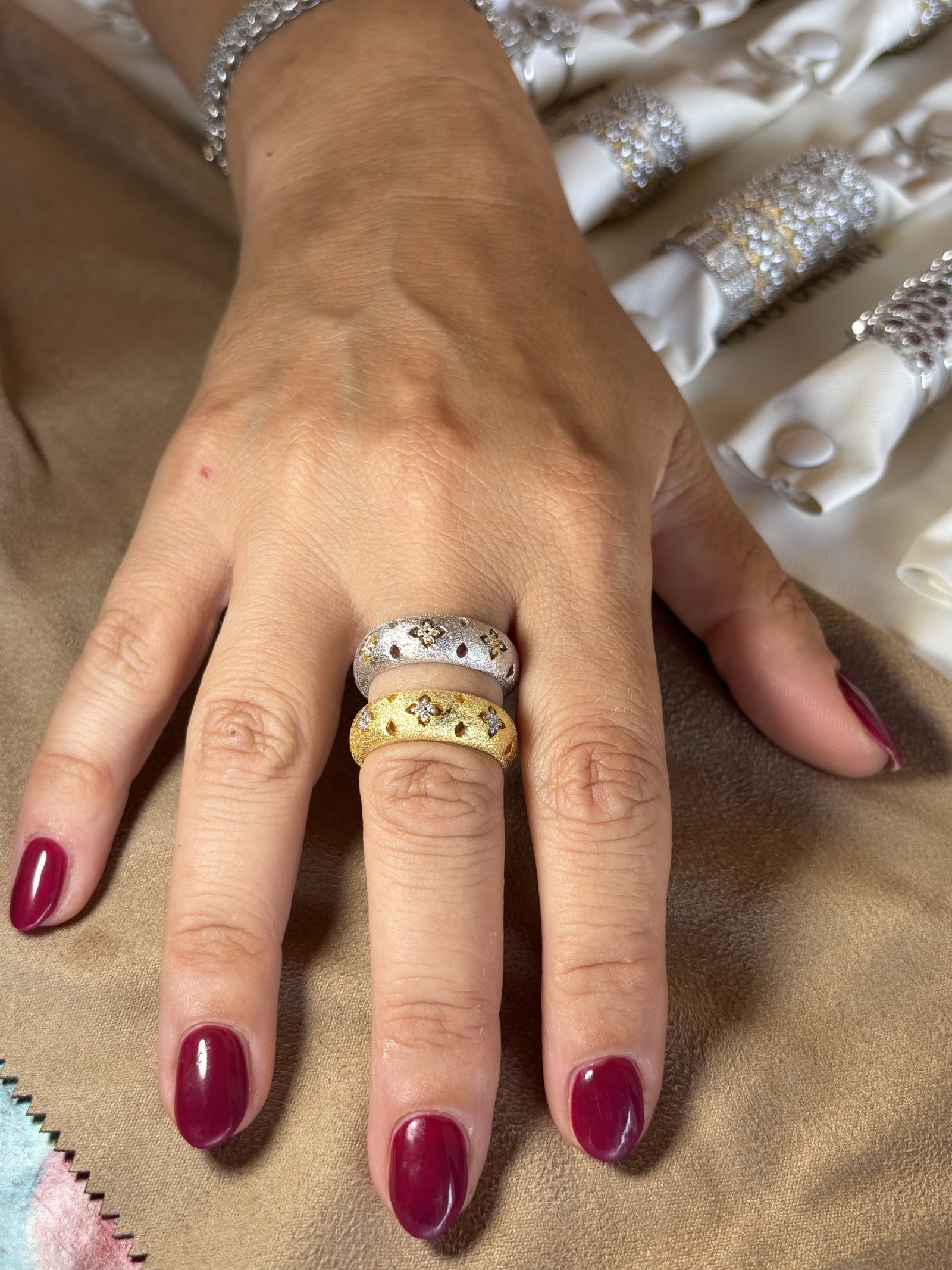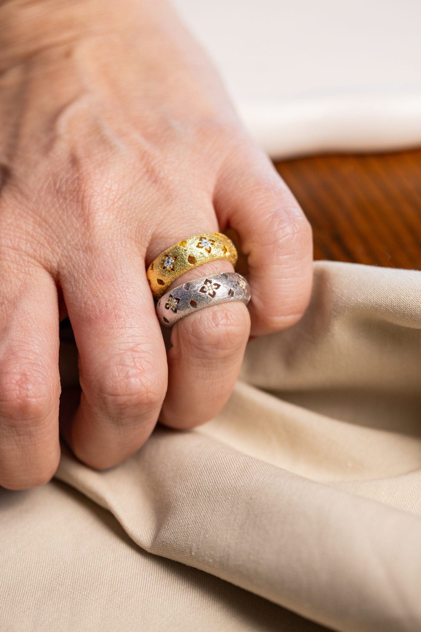 L’Anello Bombato Deco si distingue per il suo design ricercato e senza tempo. La fascia spessa e bombata è caratterizzata da una finitura satinata che dona una sensazione morbida e materica al tatto. I delicati motivi floreali intagliati sulla superficie si alternano a piccoli zirconi bianchi incastonati, che aggiungono un tocco di luce e raffinatezza.