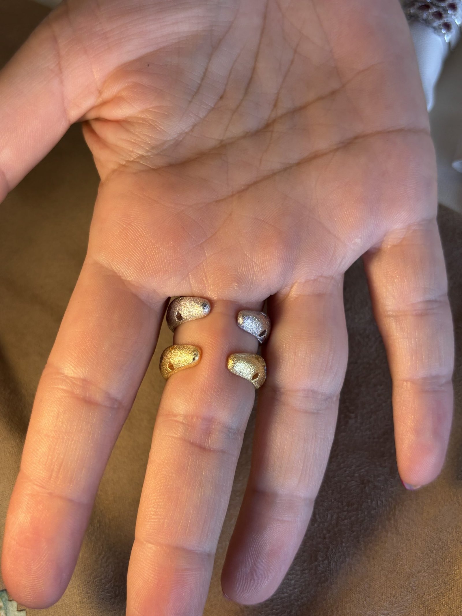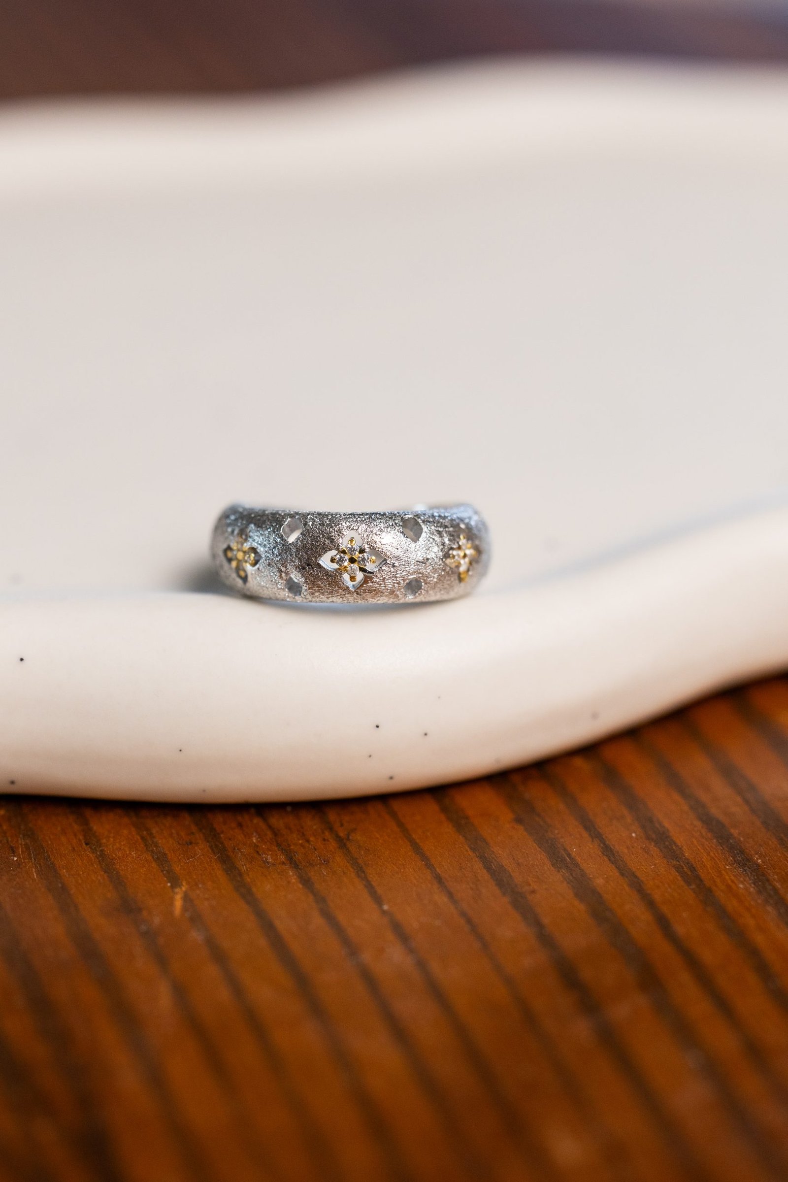 Disponibile in due varianti – finitura oro caldo o argento antico – questo anello richiama l’eleganza dei gioielli d’ispirazione vintage con una reinterpretazione moderna. È perfetto da indossare da solo per un look raffinato o da abbinare ad altri anelli dal design naturale o artigianale.