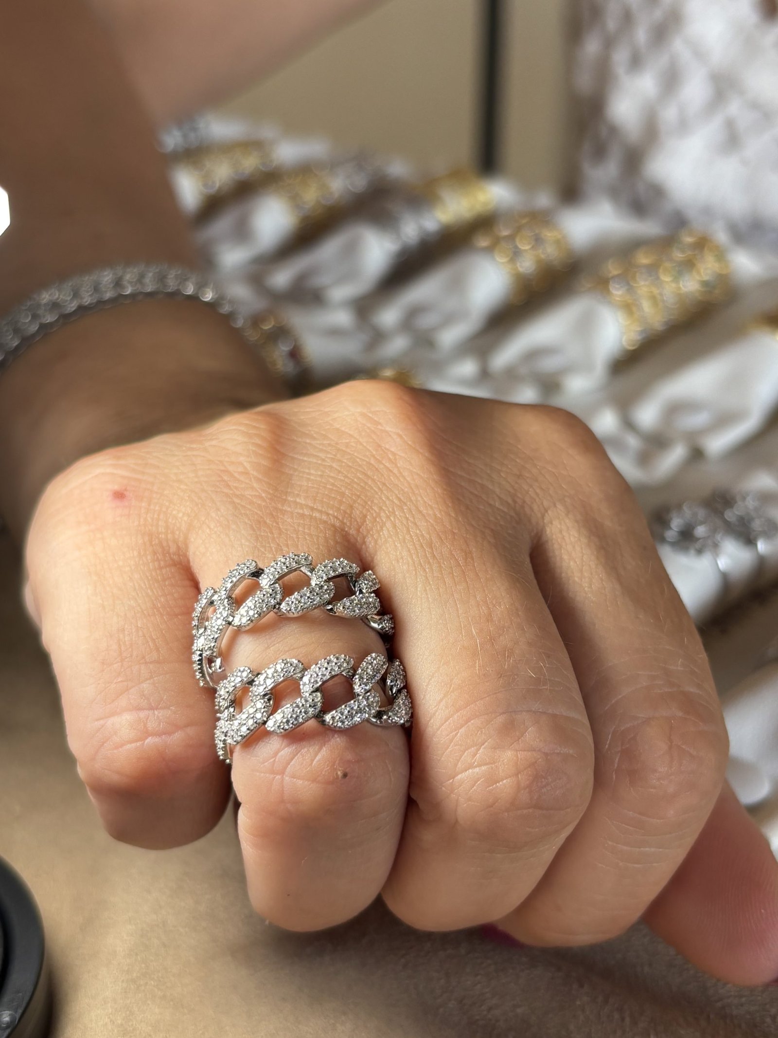 Esprimi il tuo stile con questo anello dalla presenza inconfondibile, ispirato all’iconica maglia cubana. Realizzato con maestria, il suo design audace è interamente ricoperto da un pavé di zirconi di altissima qualità, che catturano e riflettono la luce ad ogni movimento, creando un effetto di brillantezza straordinaria. Questo anello non è solo un accessorio, ma un vero e proprio pezzo statement che aggiunge un tocco di lusso e grinta al tuo look. Perfetto per chi desidera distinguersi, può essere indossato da solo per massimizzarne l’impatto o abbinato ad altri gioielli per un layering più ricco. Un’aggiunta glamour e contemporanea alla tua collezione di gioielli, ideale per occasioni speciali o per elevare il tuo stile quotidiano.