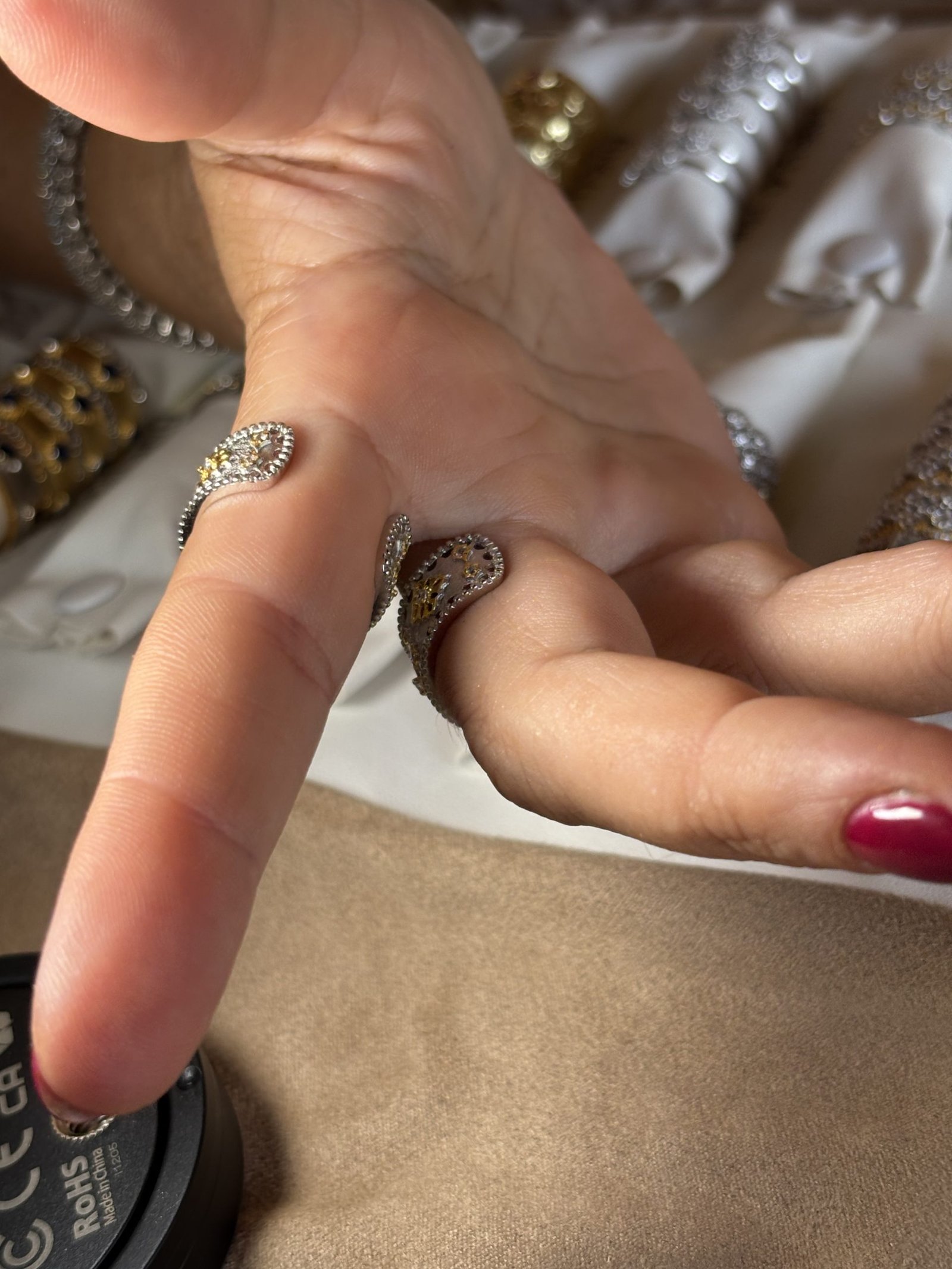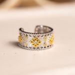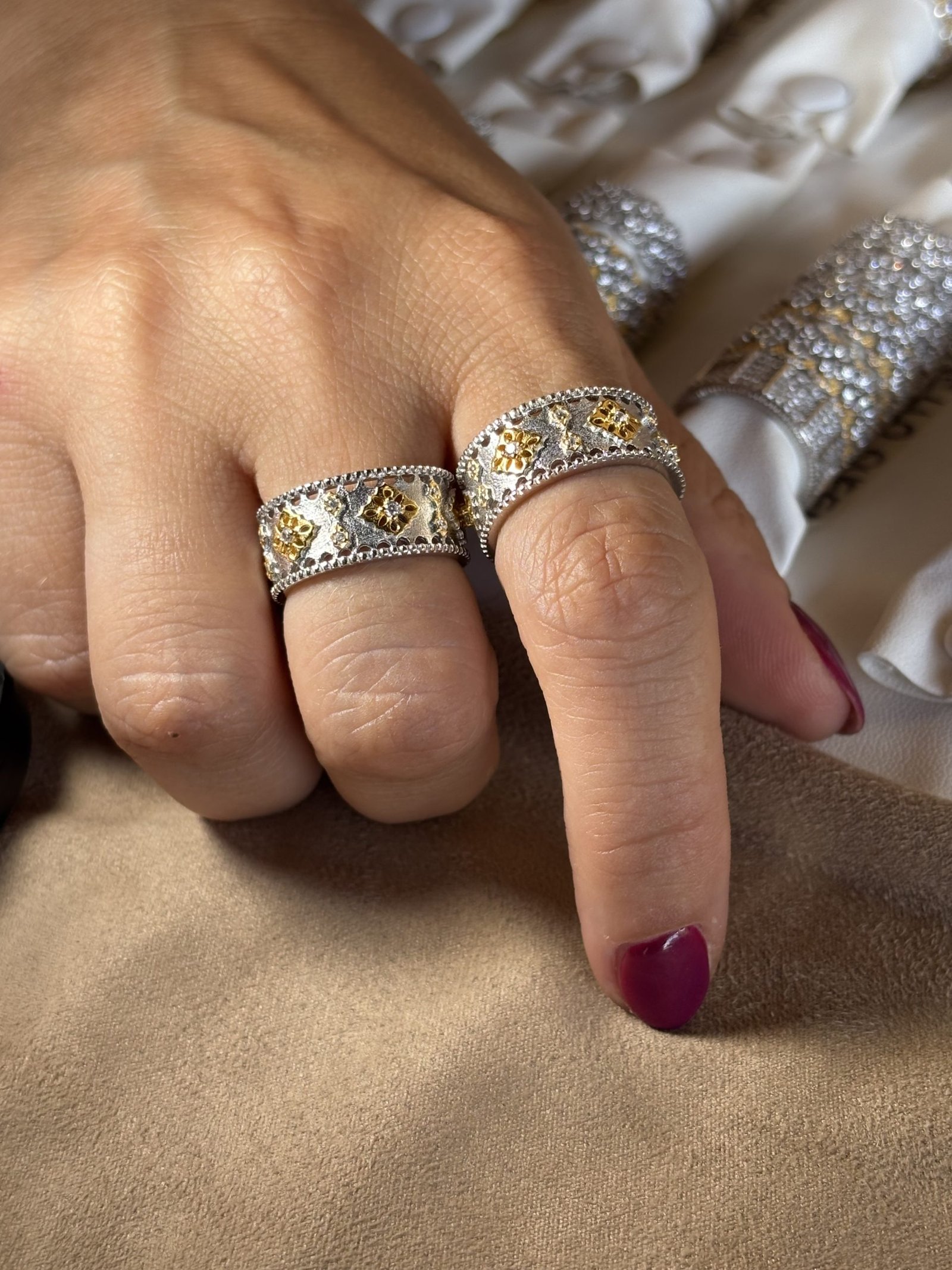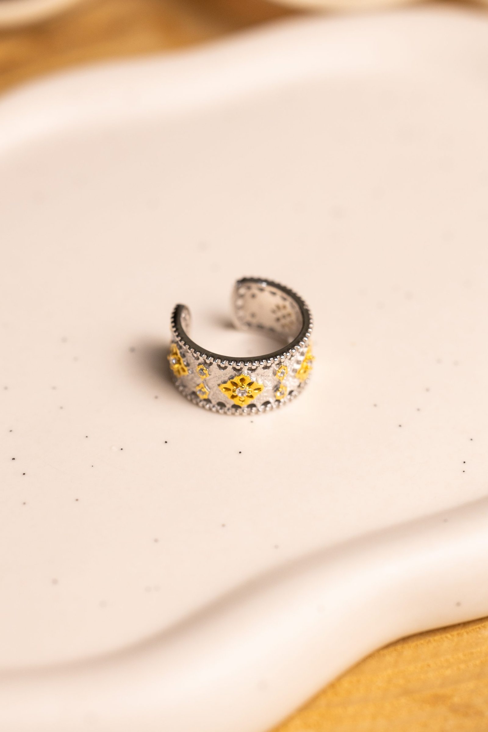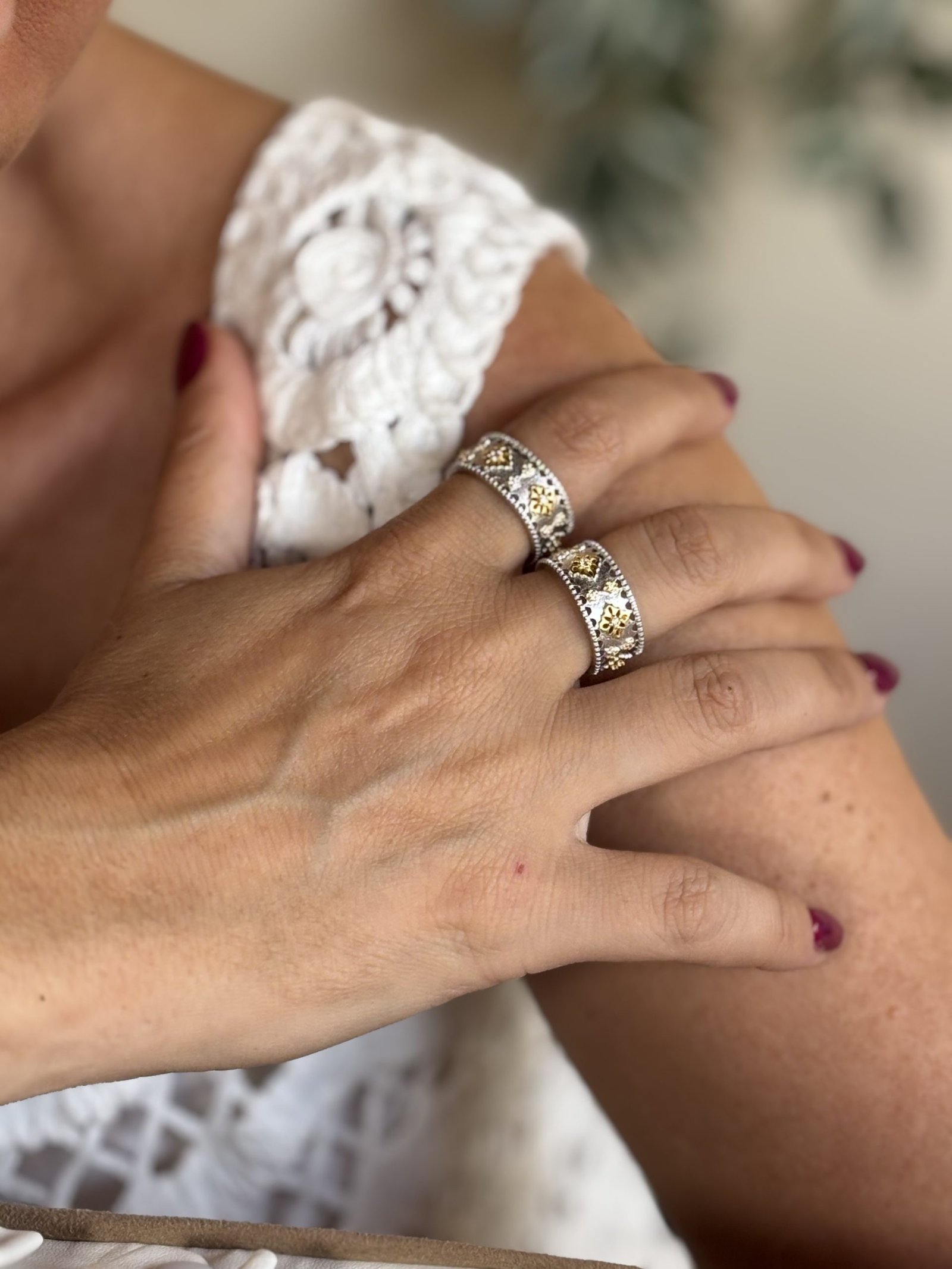 L’Anello Fascia Romantic è la scelta ideale per chi ama i dettagli delicati ma d’effetto. La fascia in finitura argento, leggermente regolabile, è impreziosita da un motivo decorativo in rilievo con inserti dorati, che evocano un’eleganza d’altri tempi rivisitata in chiave moderna.