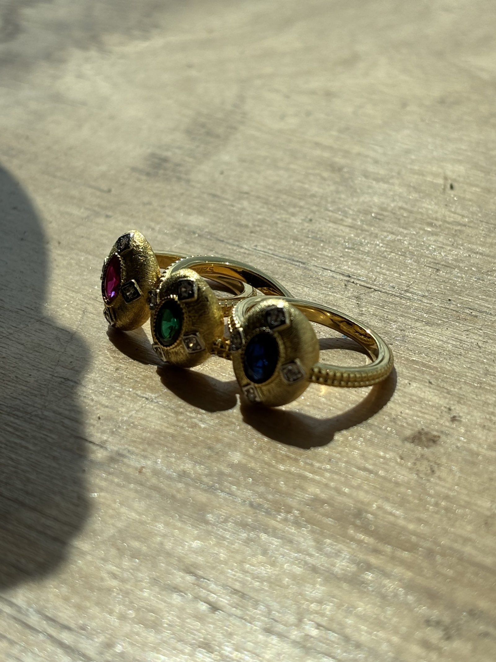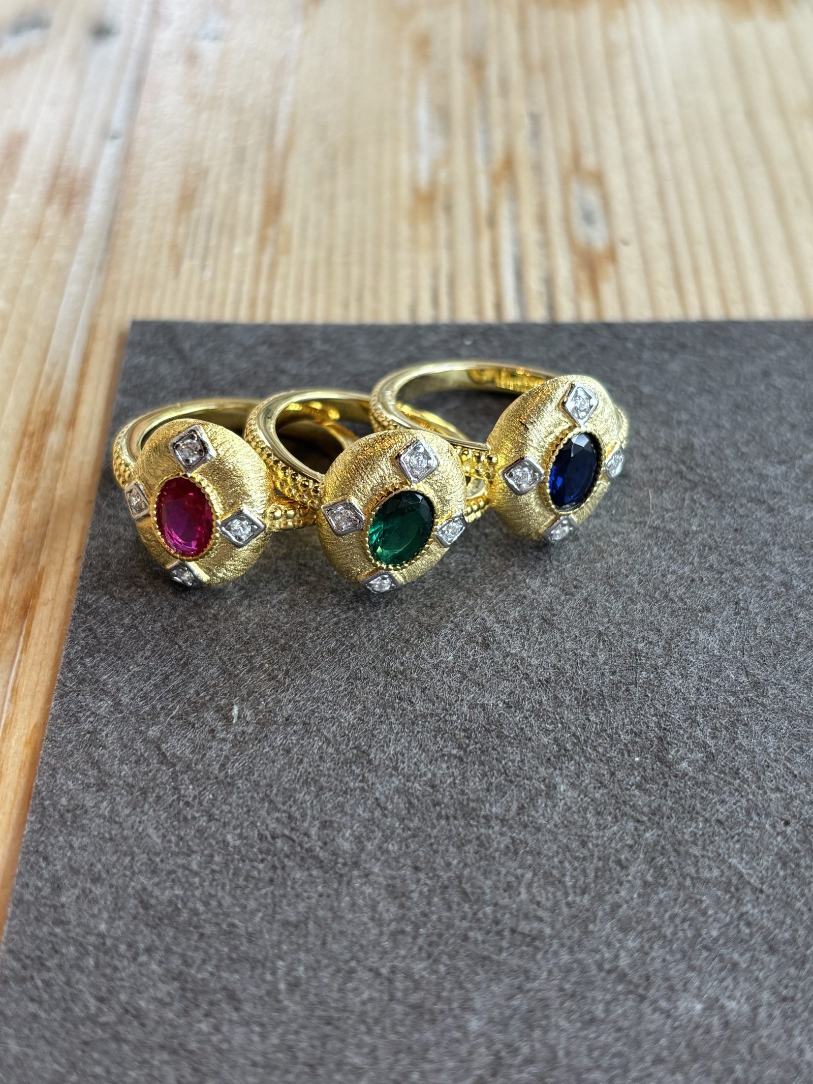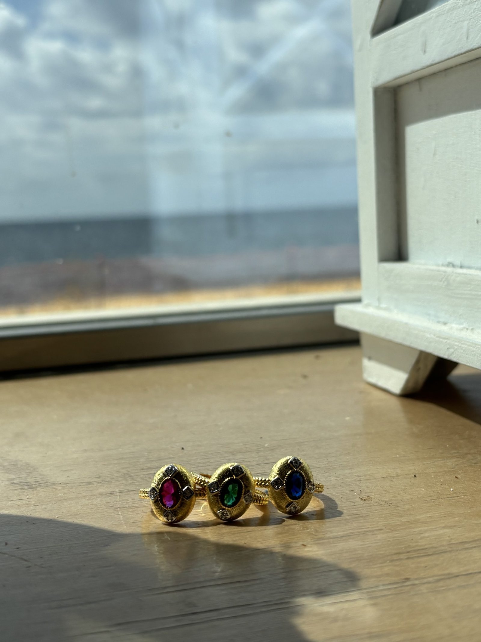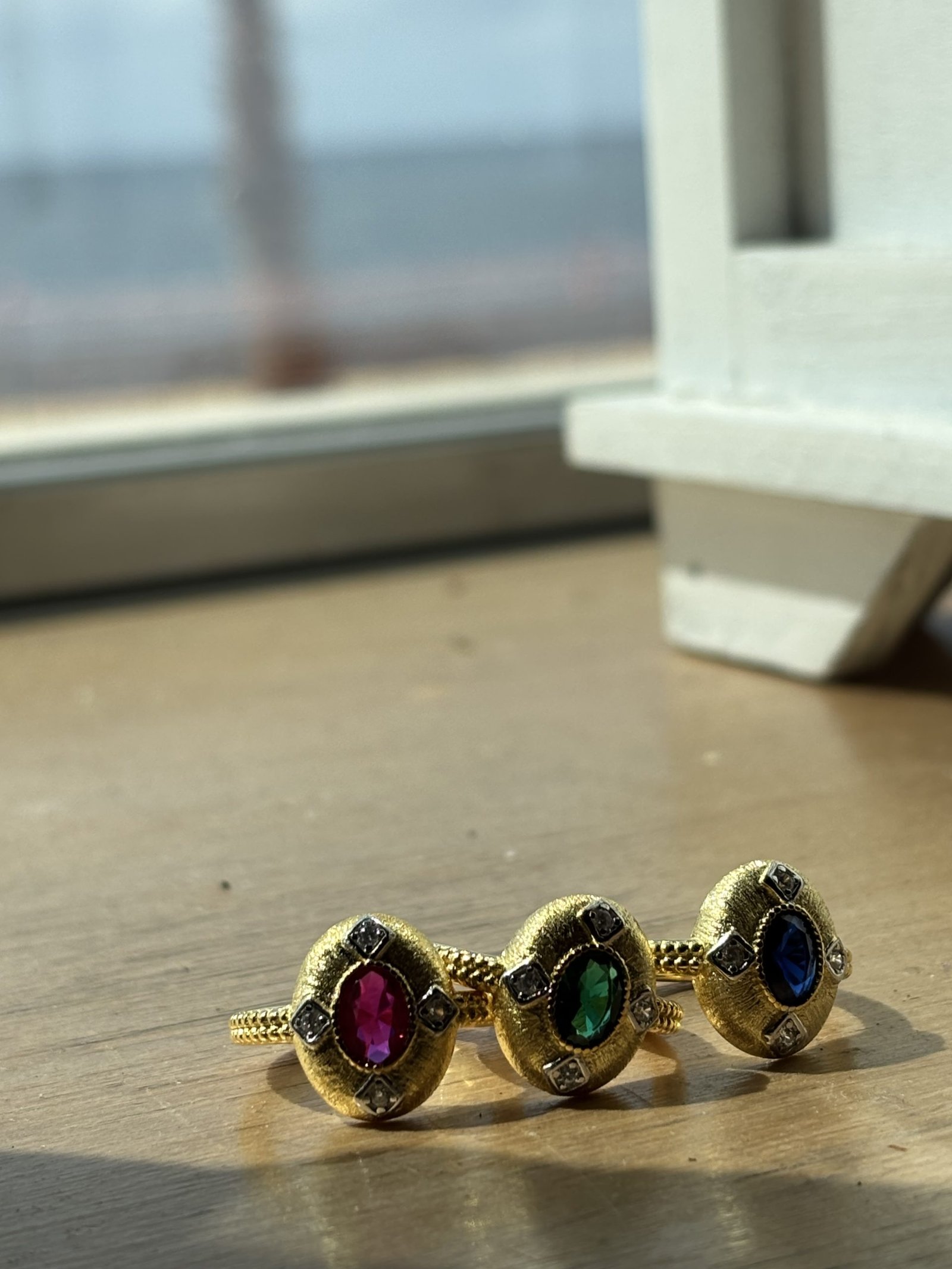 Al centro, una gemma ovale disponibile in tre colori distintivi: