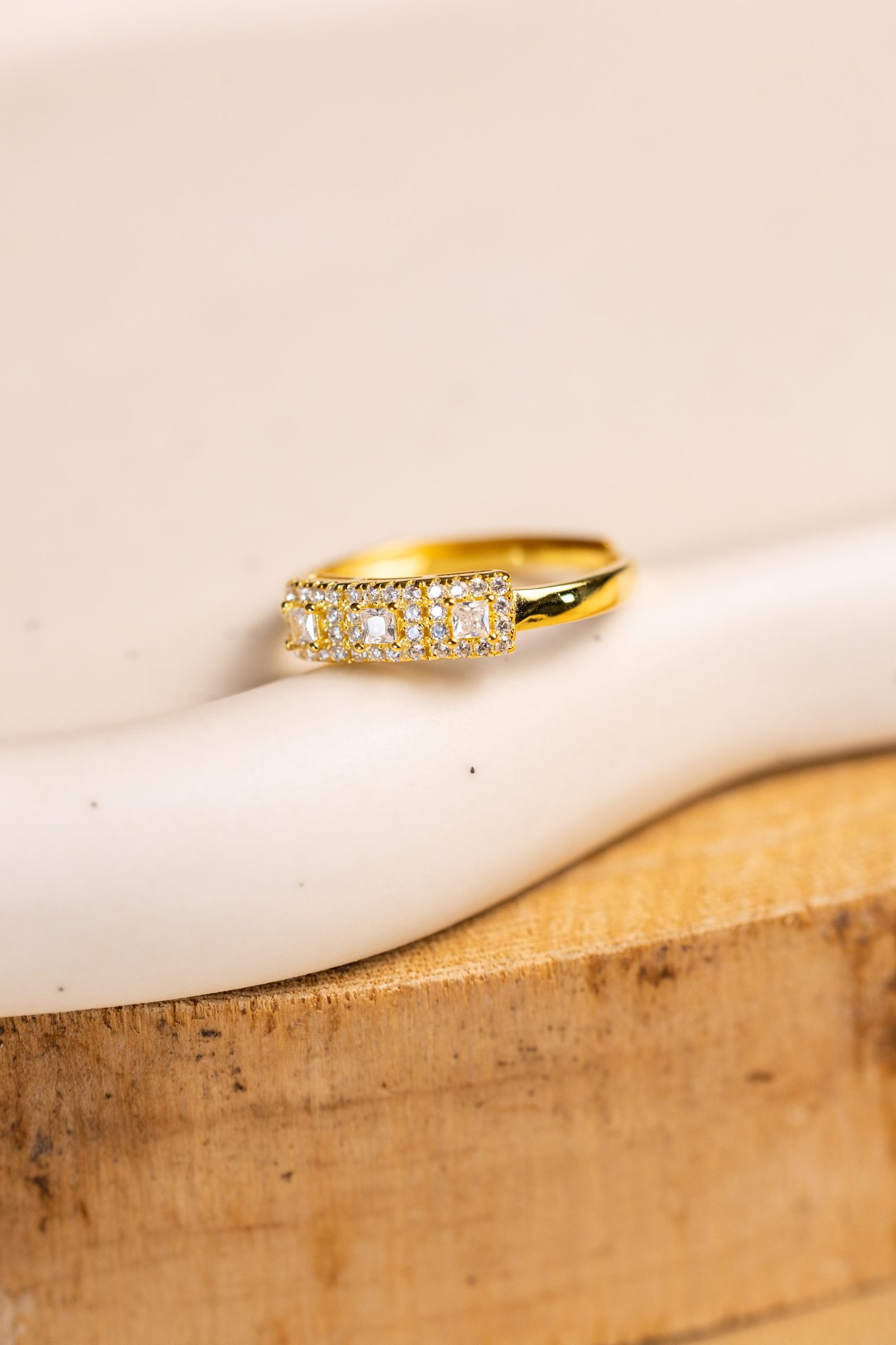 L’Anello Linea Brillante è un gioiello sobrio ma d’effetto, pensato per chi ama la semplicità elegante. Realizzato in finitura dorata lucida, è impreziosito frontalmente da tre zirconi taglio quadrato, incastonati in una cornice rettangolare di micro zirconi pavé che amplificano la luce e l’impatto visivo del design.