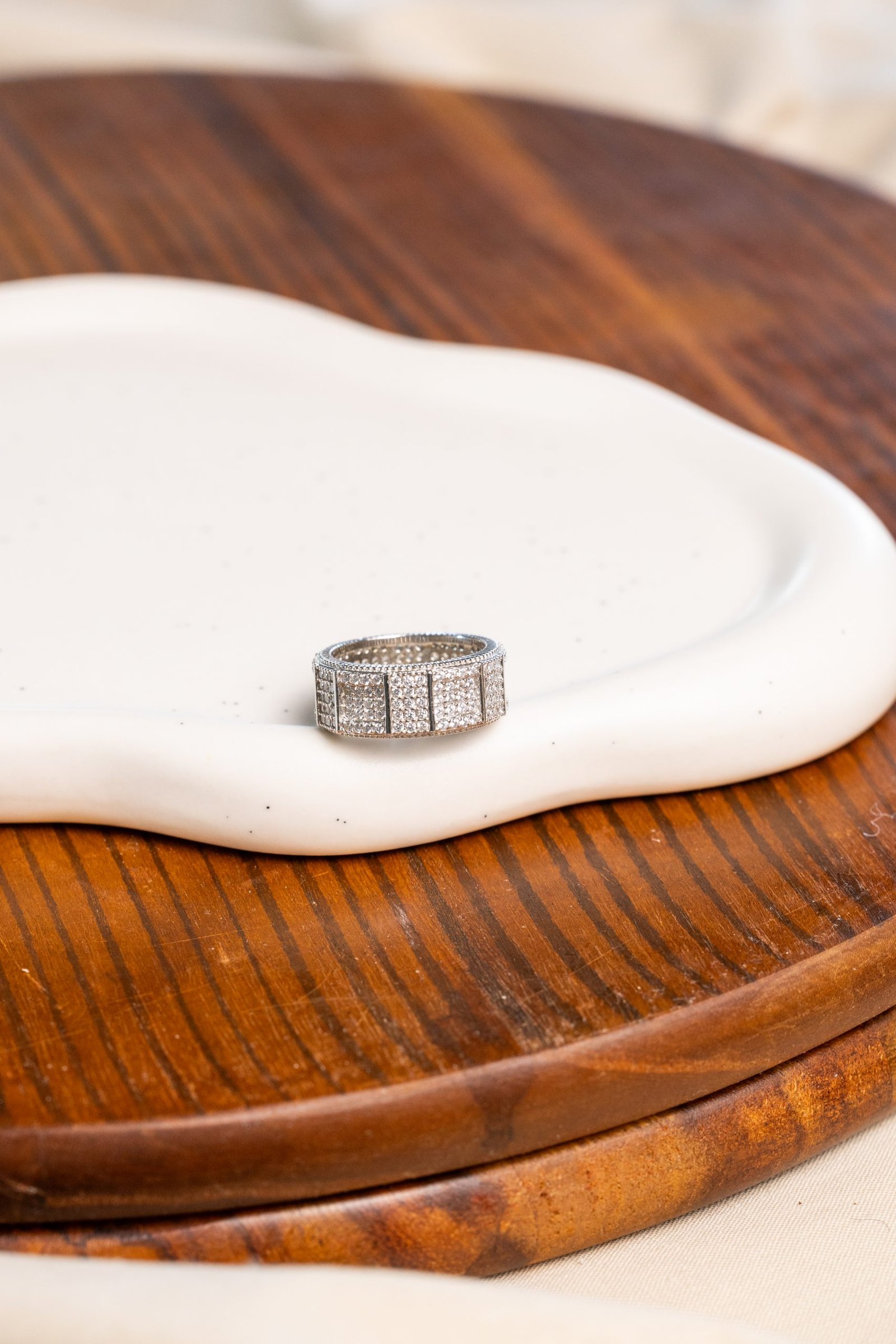 L’Anello Skyline si ispira all’eleganza grafica delle architetture contemporanee. La fascia spessa, interamente rivestita da micro zirconi bianchi, è attraversata da linee verticali incise che creano un pattern geometrico e ritmato, simile a un orizzonte urbano stilizzato.