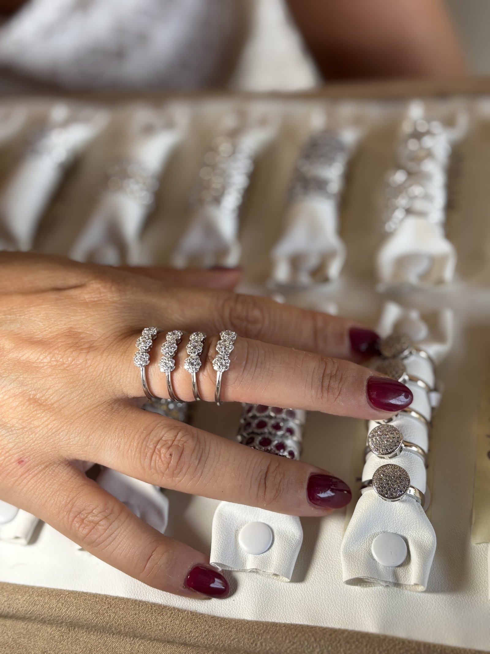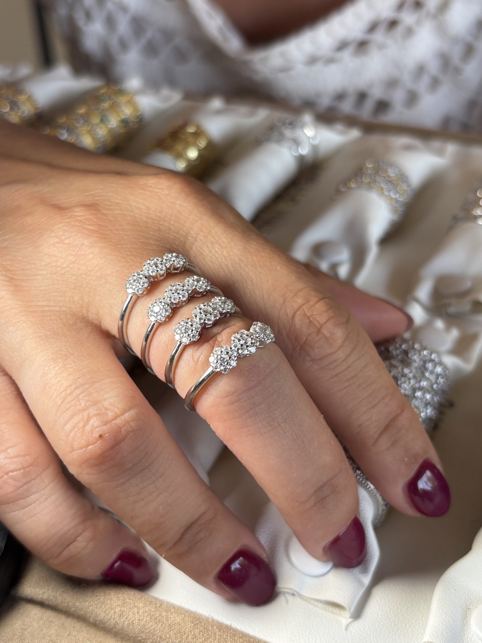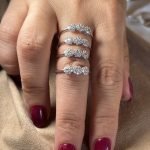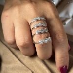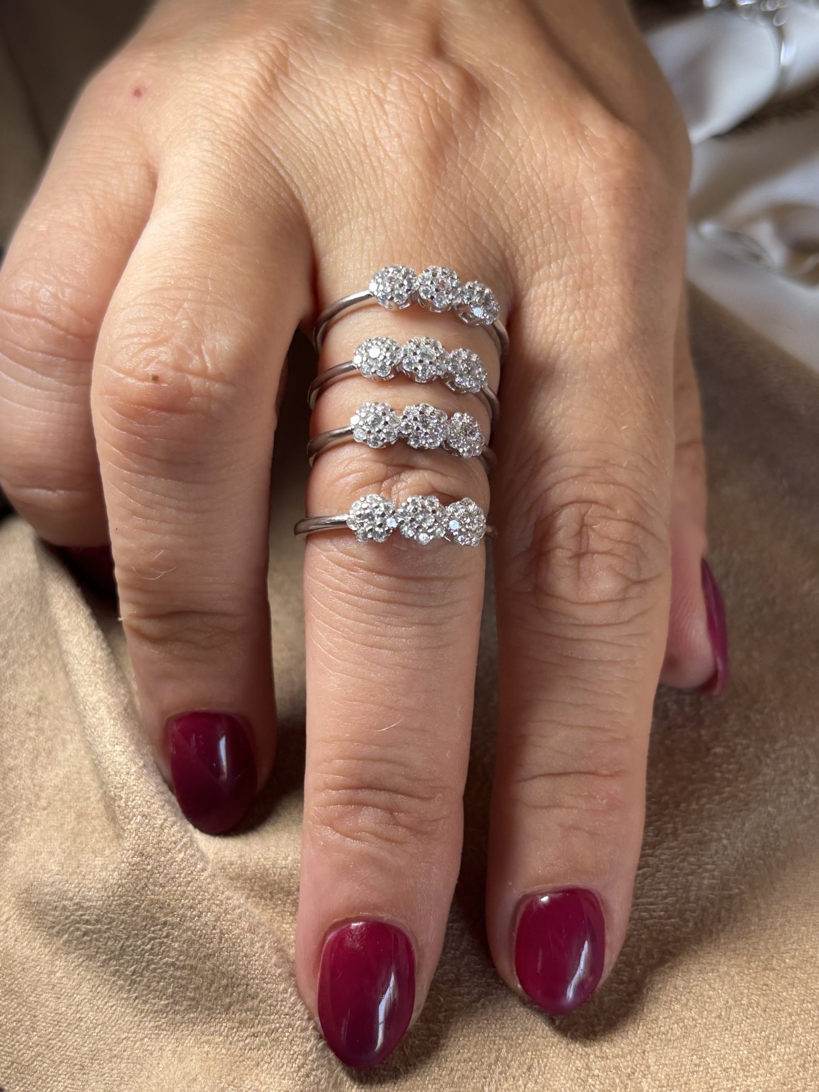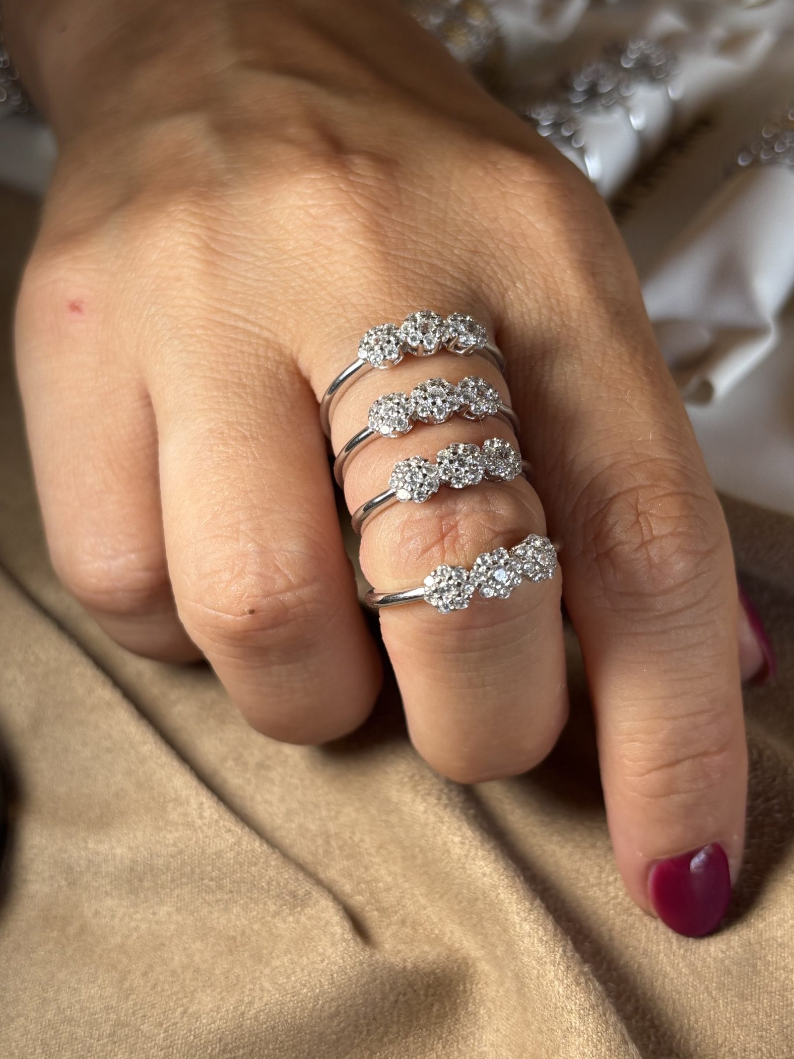 La disposizione a trio simboleggia equilibrio, continuità e armonia, rendendo questo anello ideale sia come dettaglio elegante per il quotidiano, sia come gioiello discreto ma brillante per le occasioni speciali.