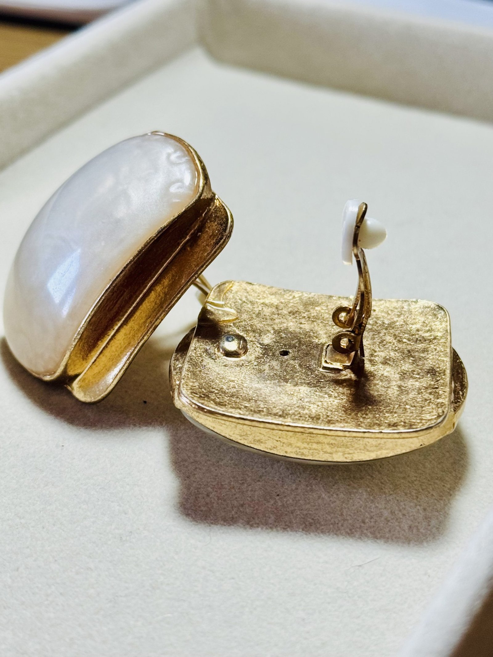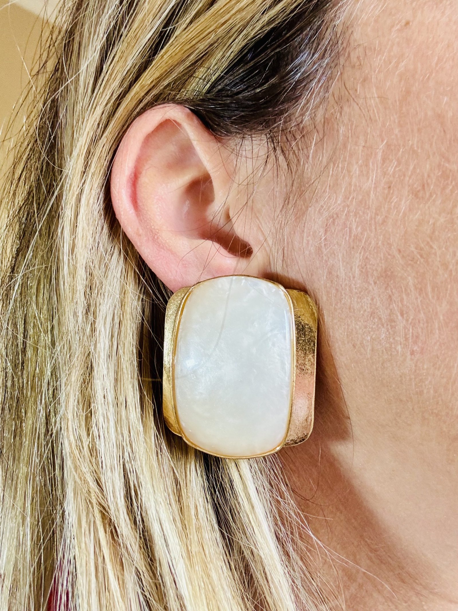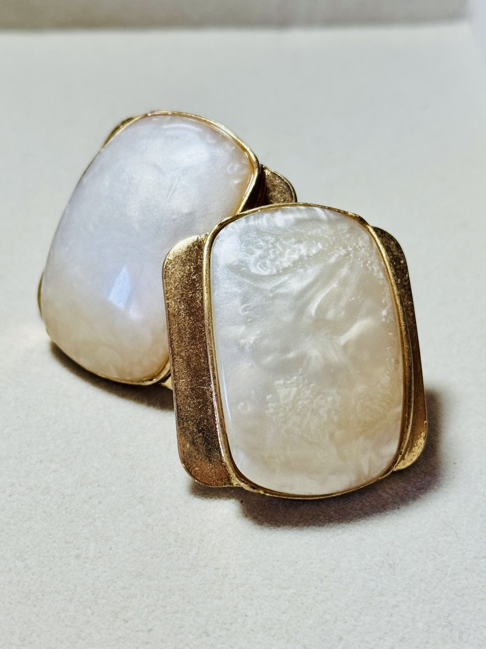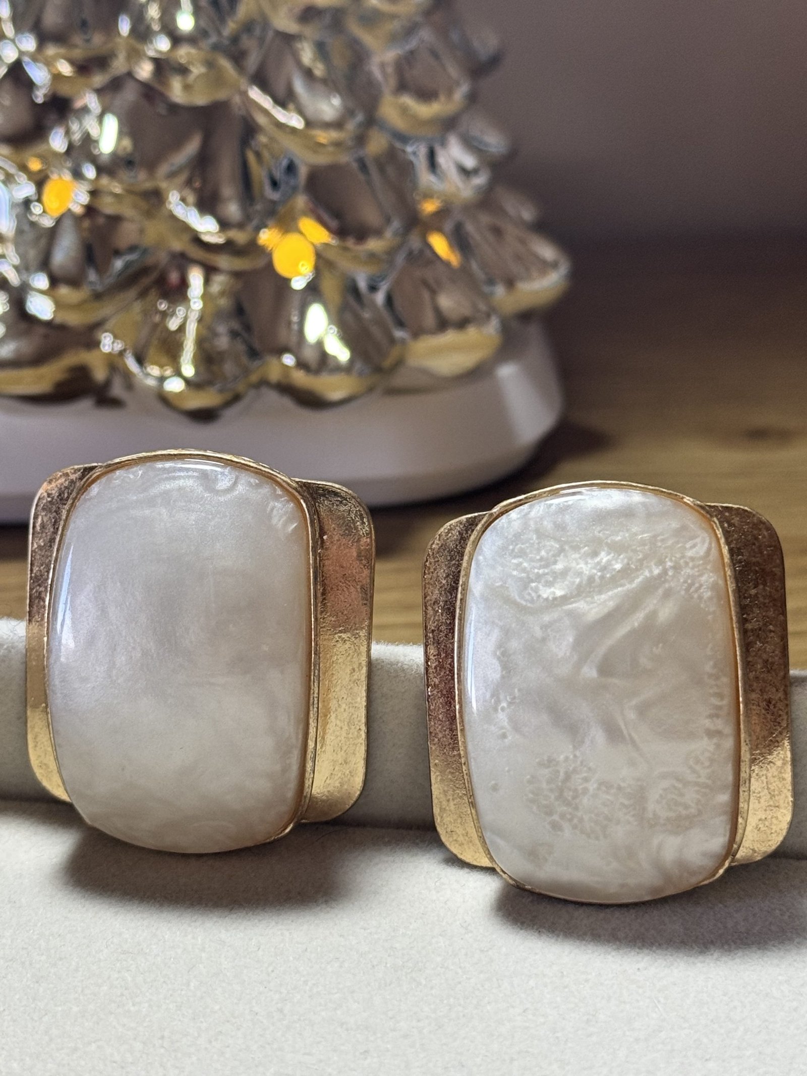Gli orecchini Aurora Madreperla uniscono fascino vintage e luminosità naturale in un design elegante e senza tempo. Realizzati in metallo dorato con finitura satinata, presentano una struttura rettangolare dai profili morbidi che incornicia un grande inserto effetto madreperla. Le sue sfumature iridescenti, ricche di giochi di luce e venature uniche, donano al gioiello un aspetto prezioso e raffinato.