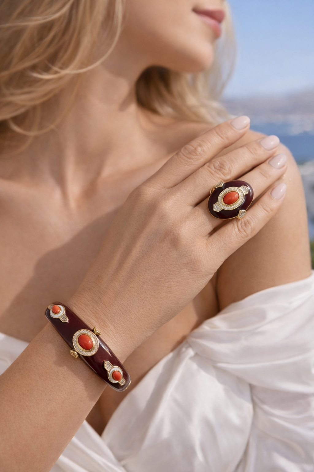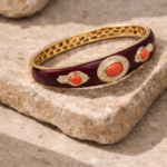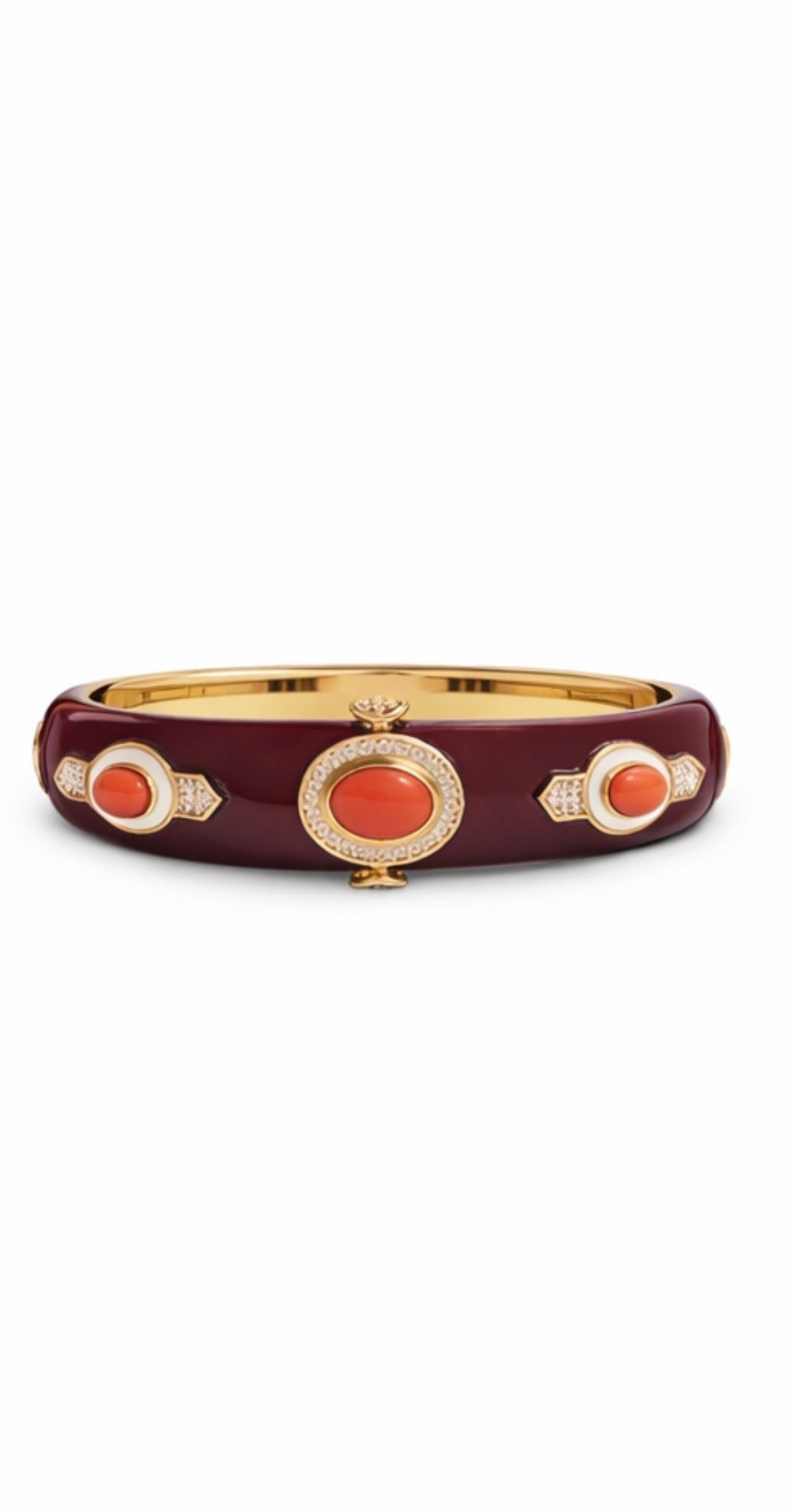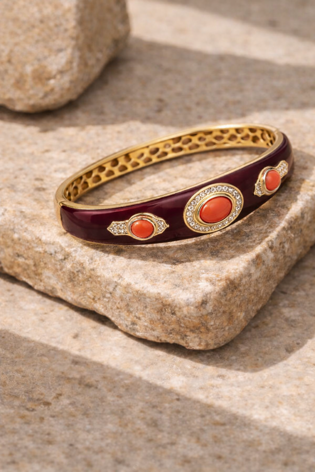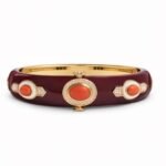 La superficie è impreziosita da una smaltatura lucida effetto profondo, che valorizza i dettagli in pasta di corallo e gli inserti in zirconi luminosi, capaci di riflettere la luce con delicatezza. Il risultato è un gioiello sofisticato, perfetto per chi cerca un bracciale elegante con corallo e zirconi dal design contemporaneo.