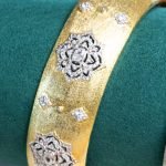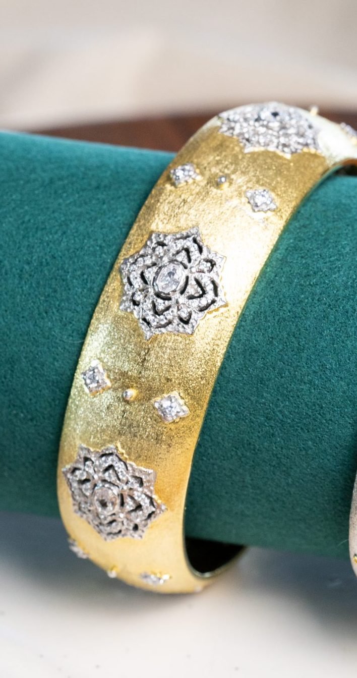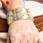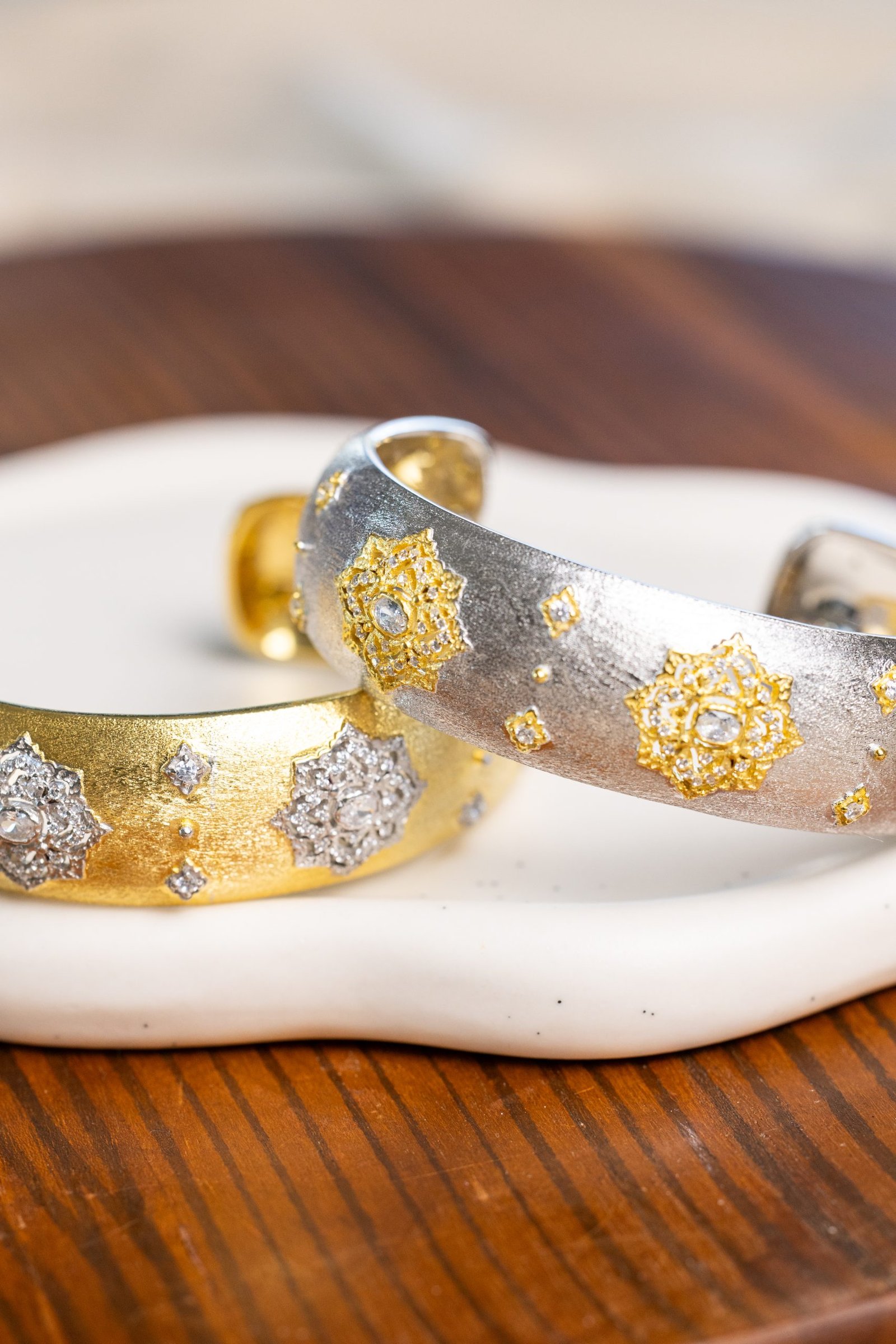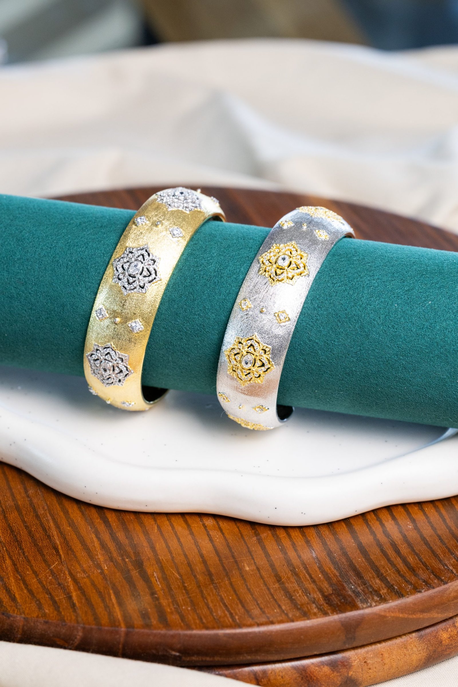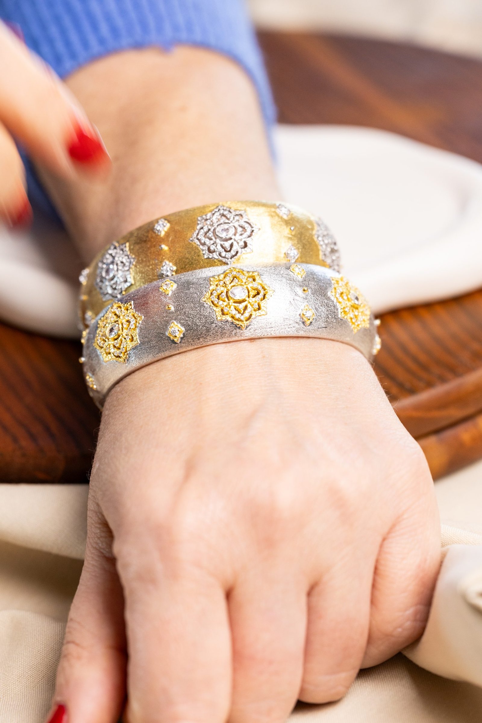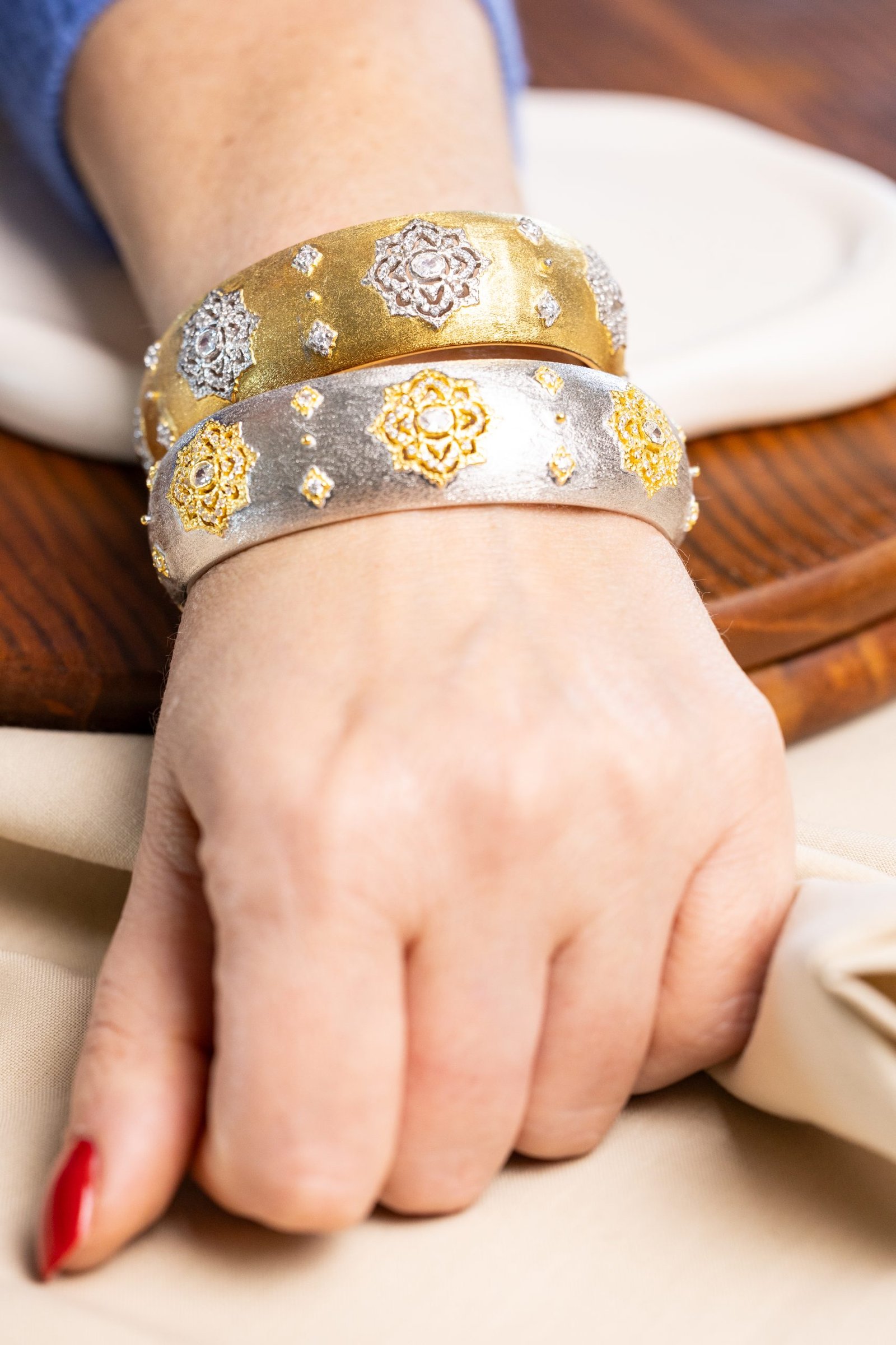 Il Bracciale Grande Stile Big è un accessorio di forte impatto visivo, che unisce ispirazioni storiche e stile contemporaneo. La sua forma rigida e avvolgente è arricchita da un’elaborata decorazione in rilievo: motivi floreali e geometrici realizzati con una raffinata lavorazione bicolor (oro e argento), impreziositi da piccoli zirconi bianchi.