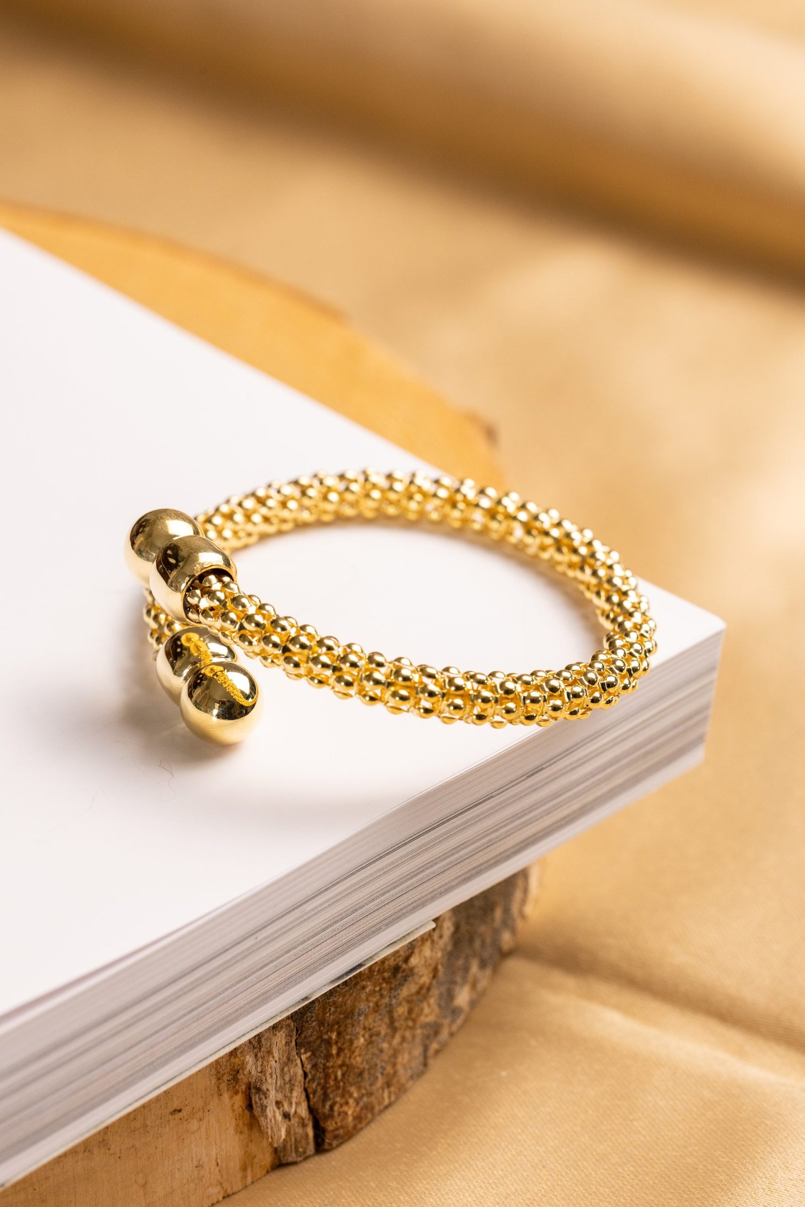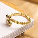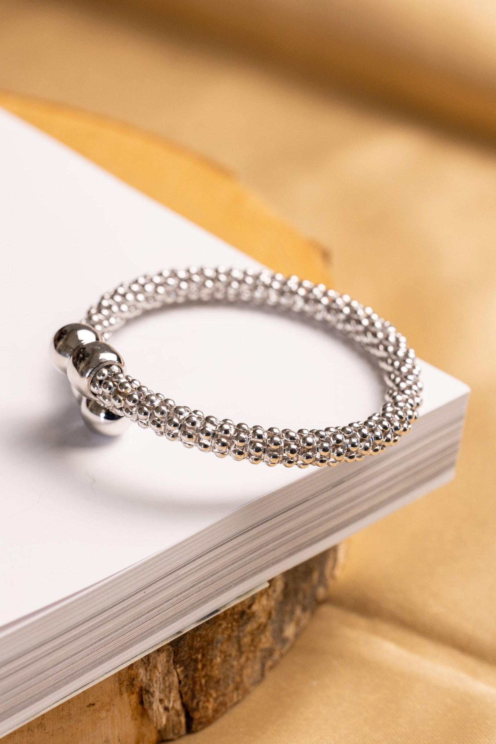 La superficie è composta da una fitta texture sferica che dona una sensazione di movimento e tridimensionalità, mentre le estremità lisce e bombate aggiungono un contrasto armonico, enfatizzando la forma circolare e aperta del bracciale.
