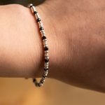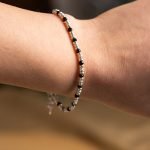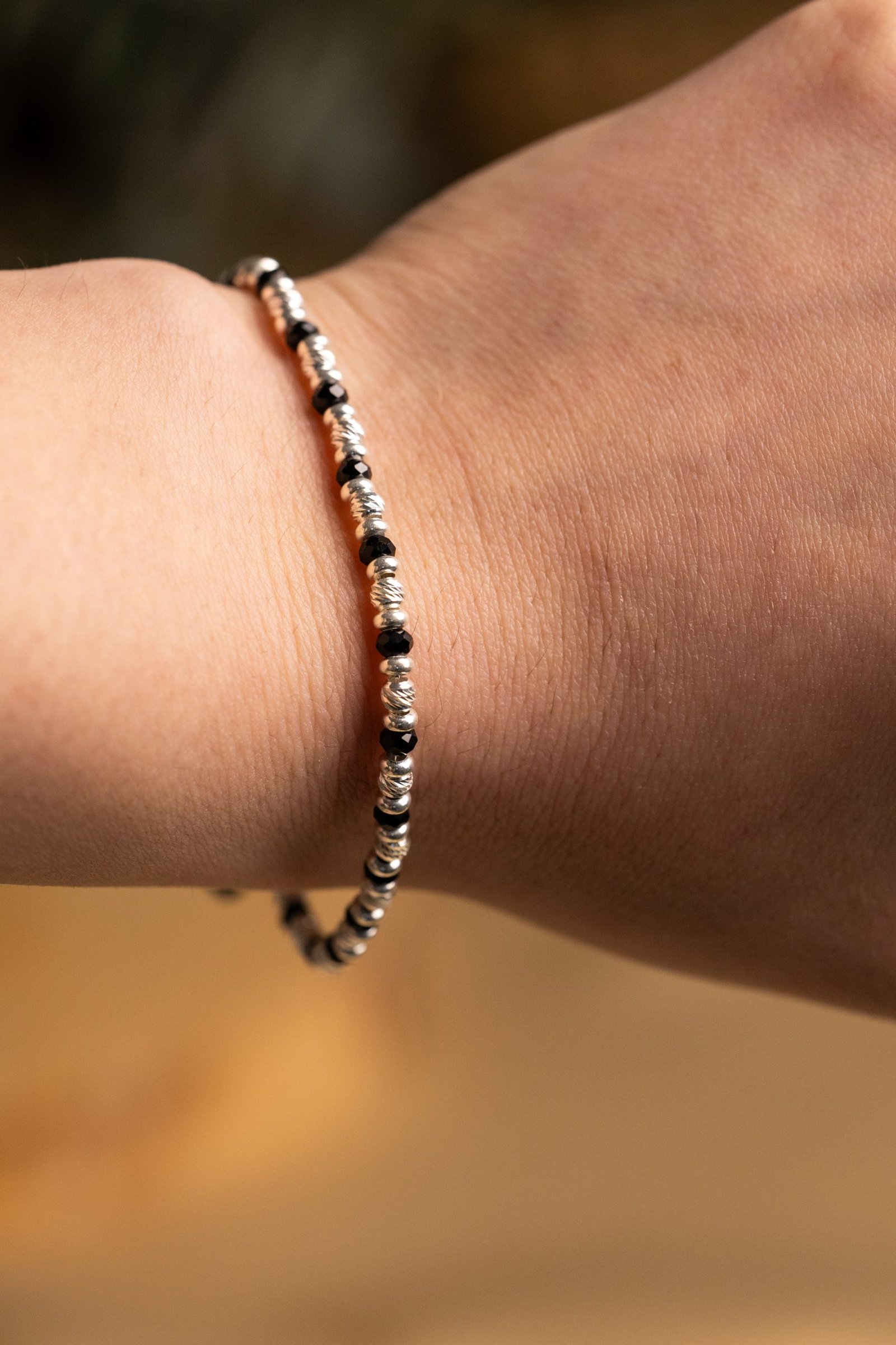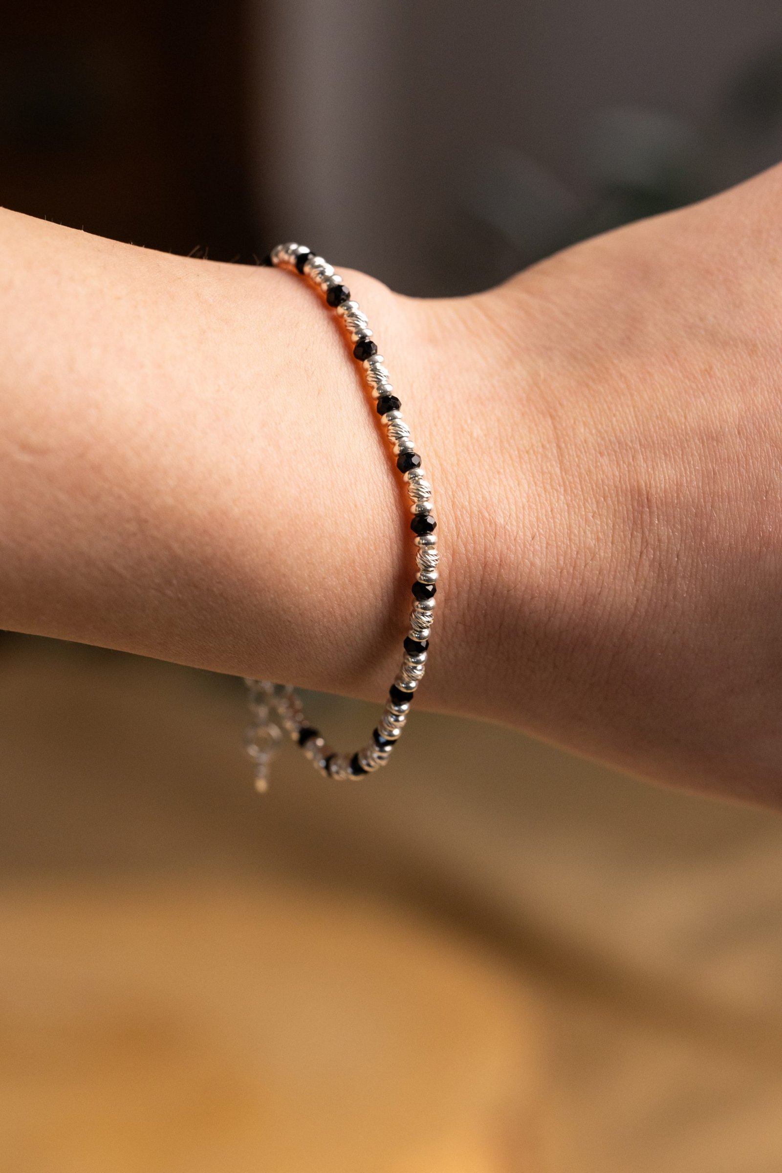 Bracciale regolabile con motivo “a scacchi”, composto da elementi in argento e pietre nere sfaccettate, per un look raffinato e contemporaneo.