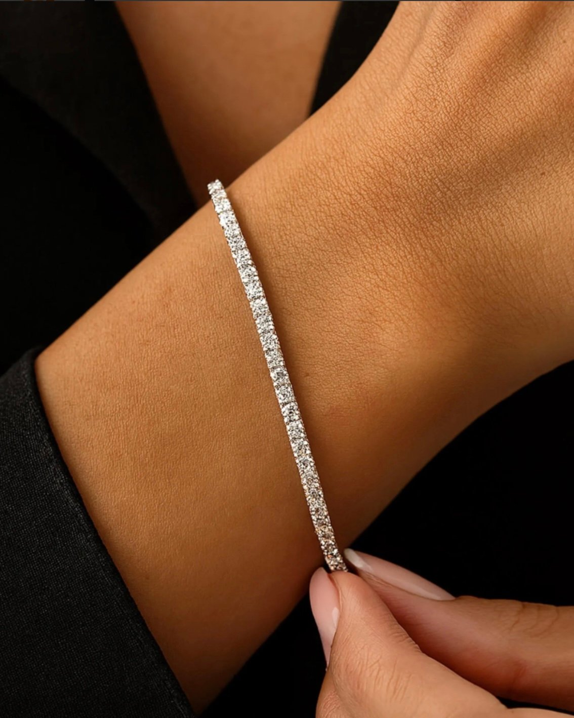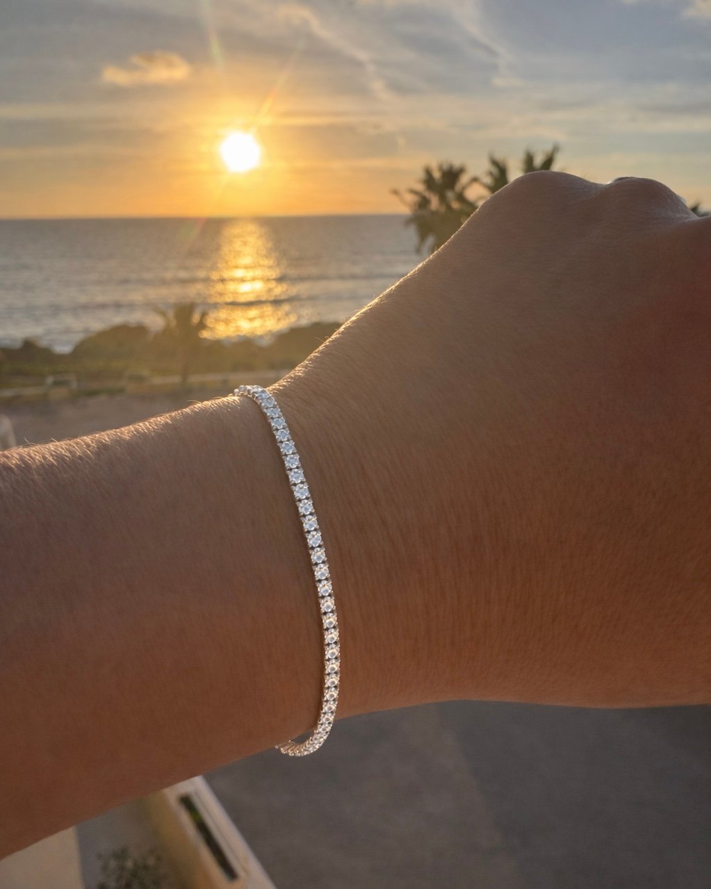 La luce si riflette su ogni singola pietra creando un effetto scintillante ma mai eccessivo, perfetto sia per l’uso quotidiano che per occasioni speciali. La dimensione da 2 mm lo rende sottile ed elegante, ideale da indossare da solo o da abbinare ad altri bracciali per un look più moderno e sofisticato.