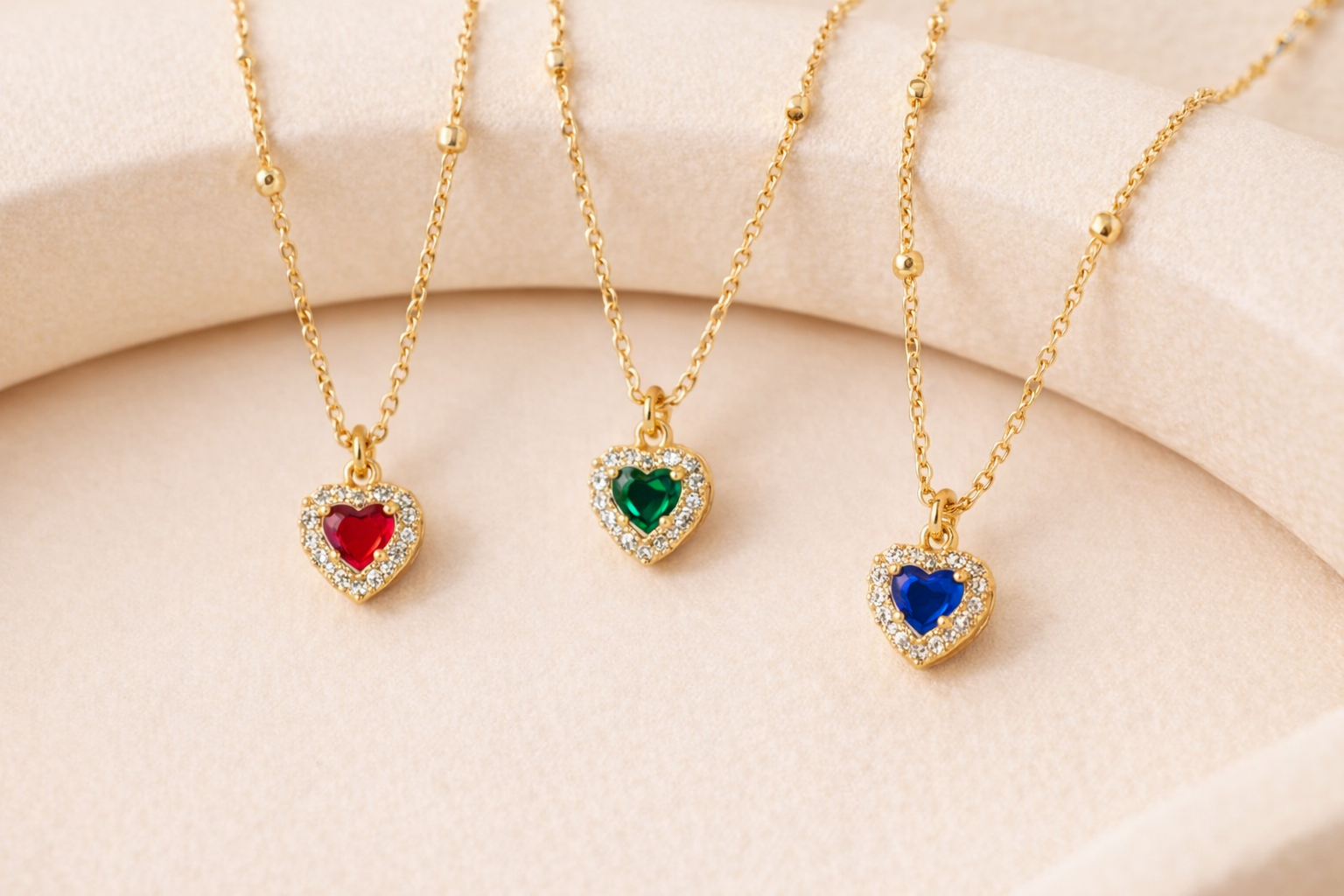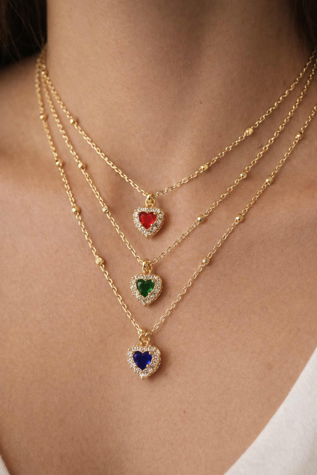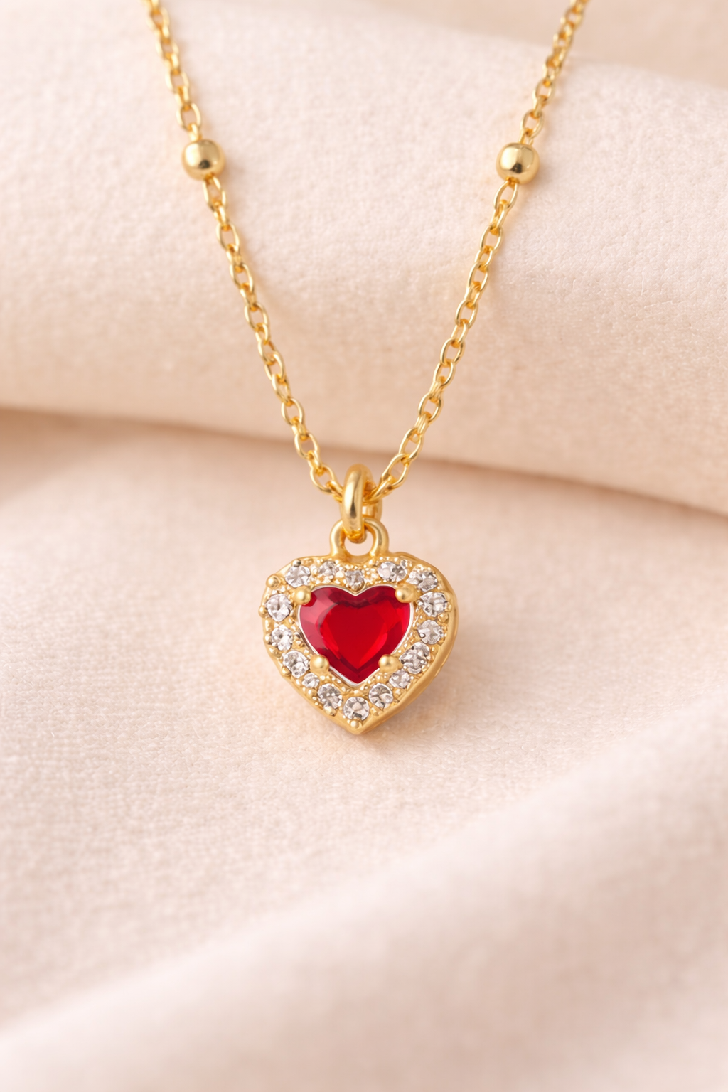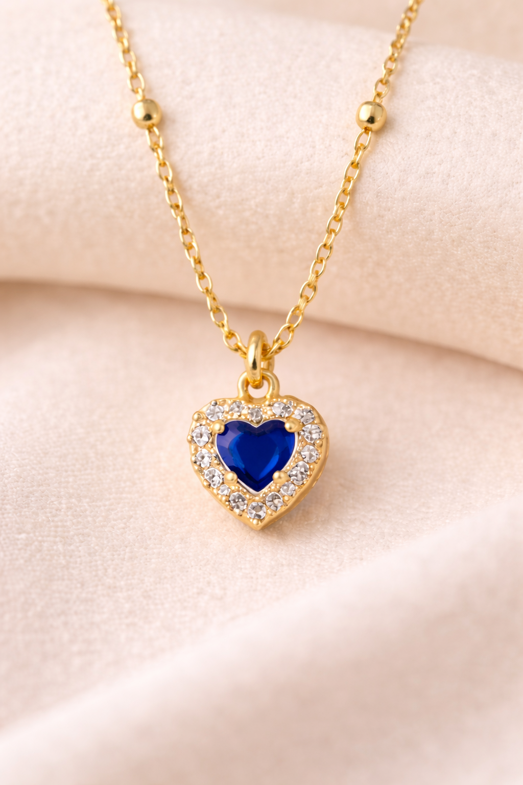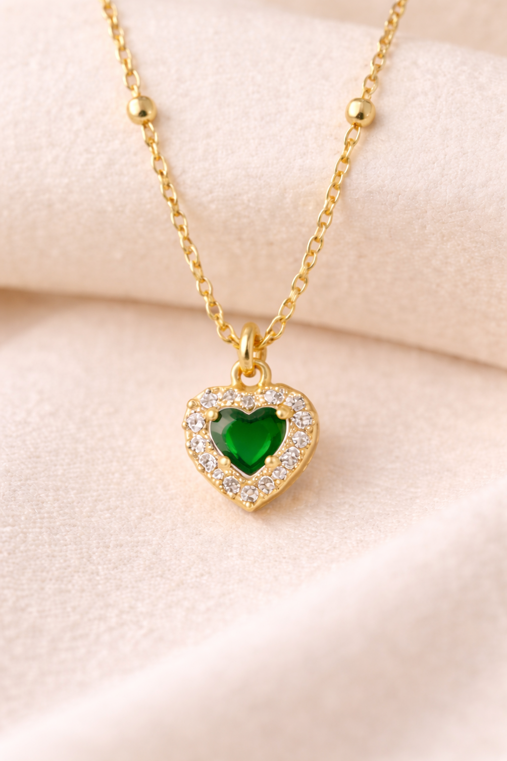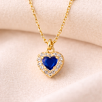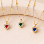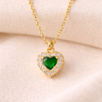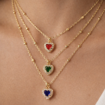 La delicata catena rosario è arricchita da piccole sfere in argento placcato oro, mentre il pendente a forma di cuore è impreziosito da una pietra colorata centrale circondata da zirconi brillanti su base placcata oro, che donano luce ed eleganza al gioiello.