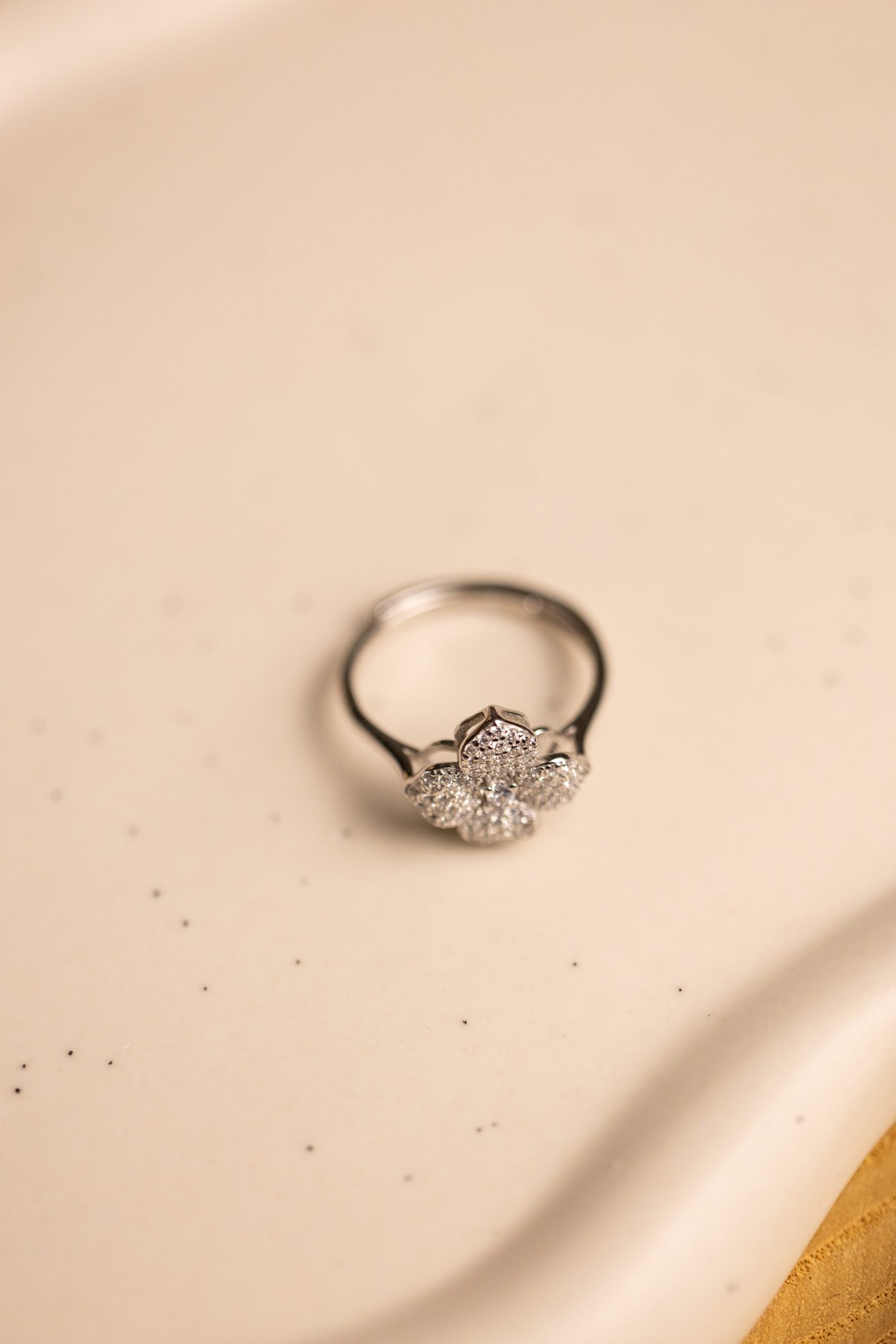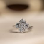 Fiore di Luce è un anello che celebra la femminilità attraverso un design raffinato e senza tempo. Il protagonista è un fiore a cinque petali delicatamente sagomati, ognuno impreziosito da una fitta pavé di zirconi bianchi che riflettono la luce con una brillantezza sottile ma intensa. Il cuore del fiore, anch’esso illuminato da piccoli cristalli, completa il disegno con armonia e grazia.