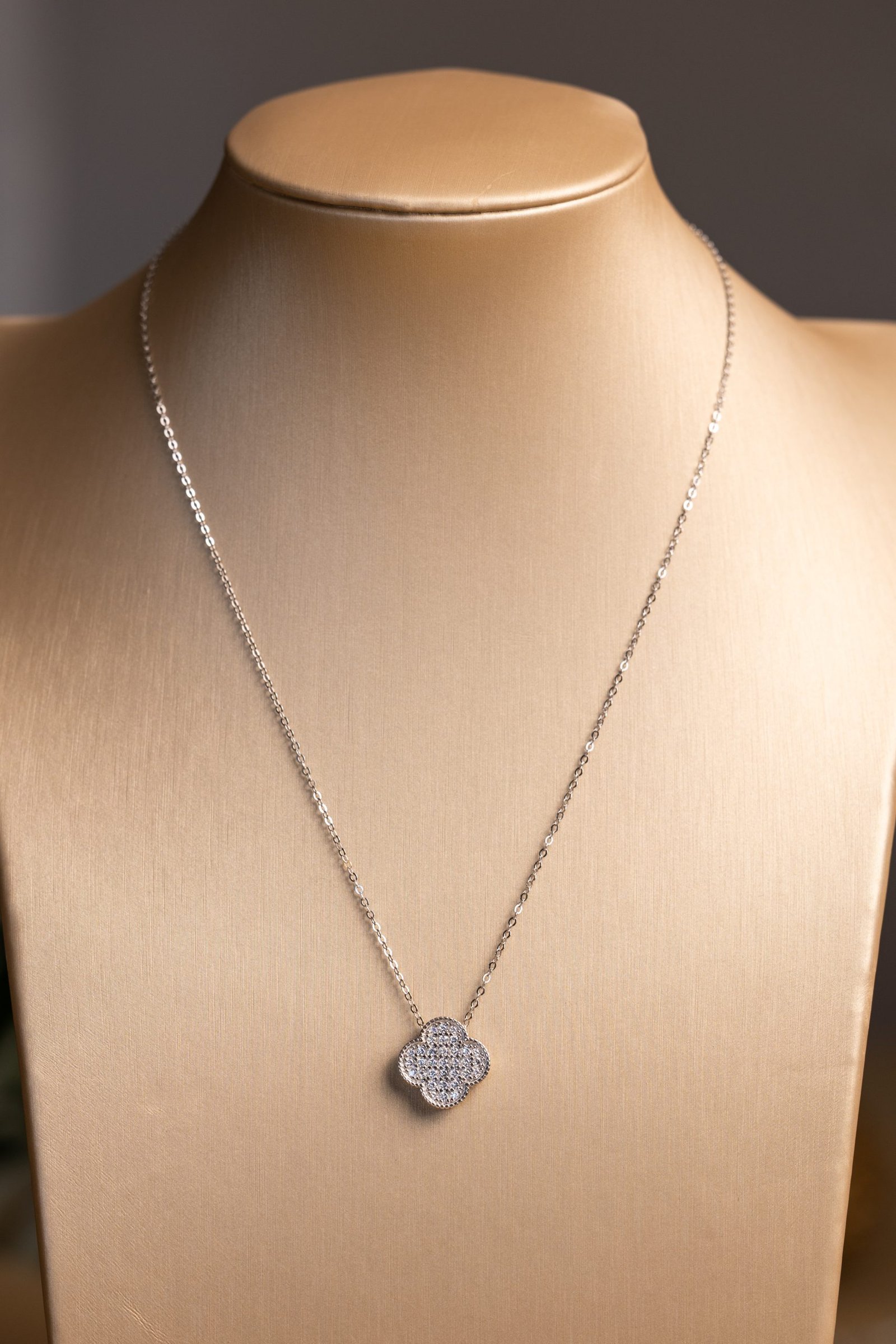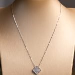 Fiore Incantato è una collana pensata per chi ama l’eleganza discreta ma luminosa. Il ciondolo, dalla caratteristica forma di fiore a quattro petali dolcemente arrotondati, è interamente impreziosito da zirconi bianchi incastonati con cura per creare un effetto pavé raffinato e scintillante.