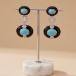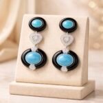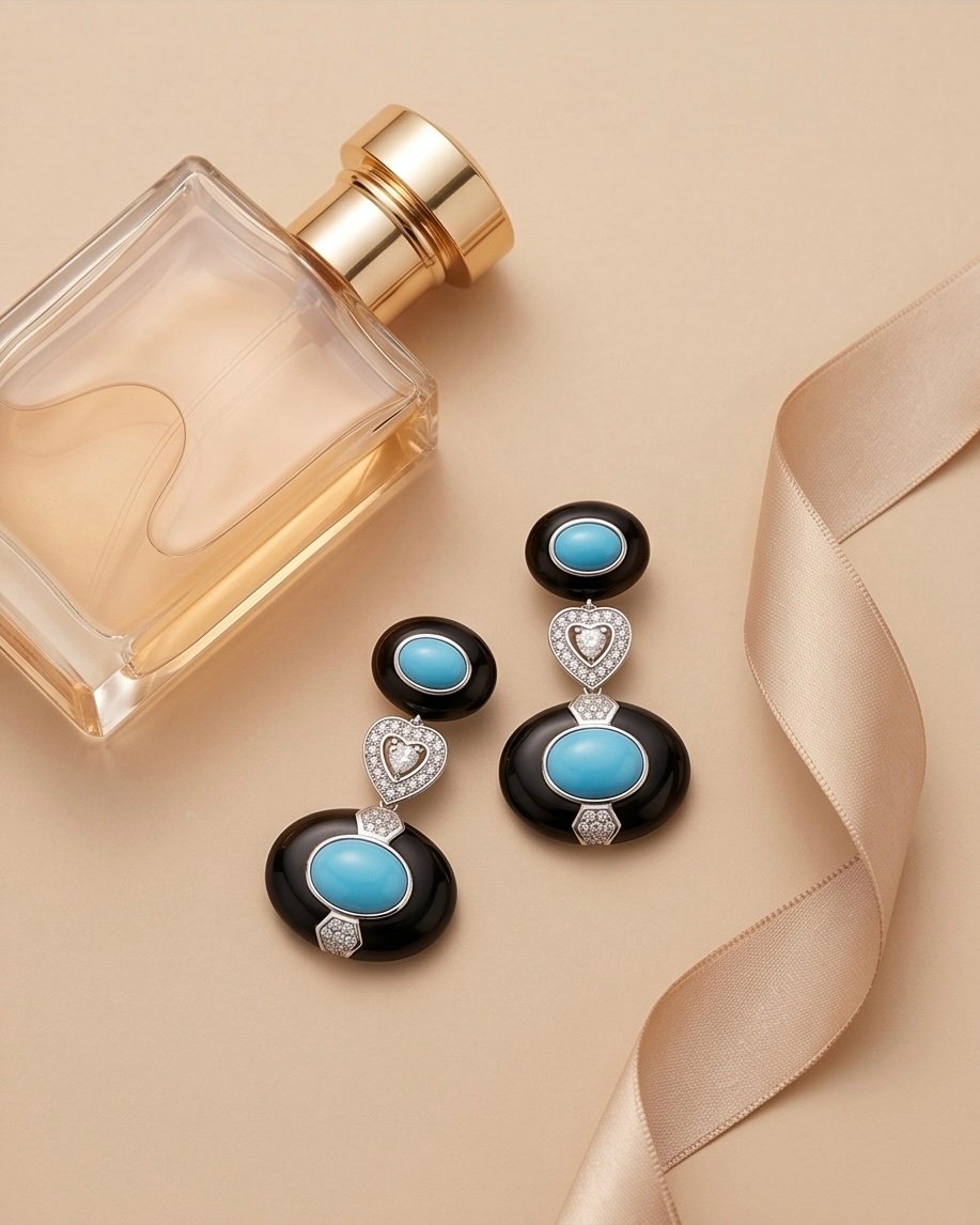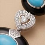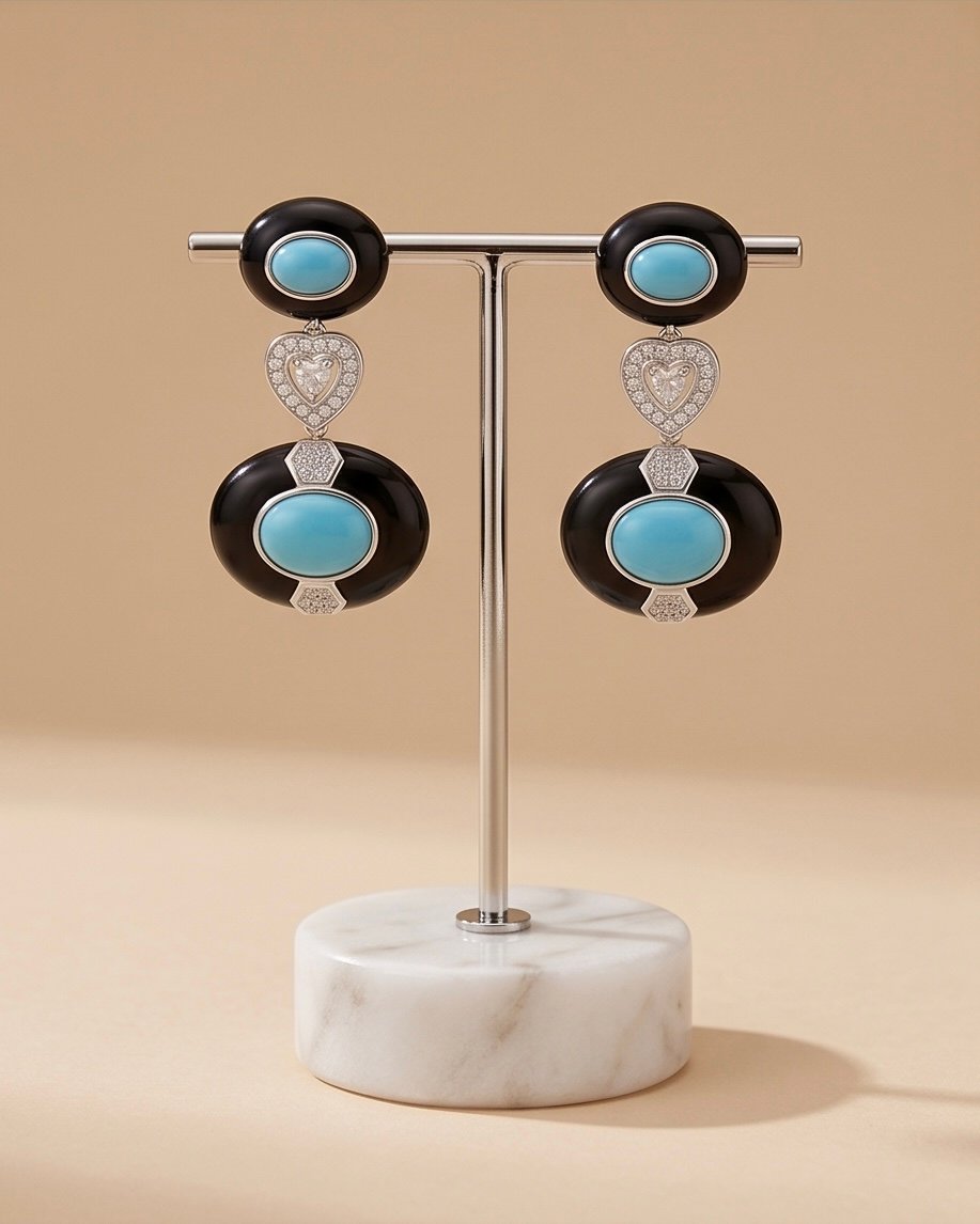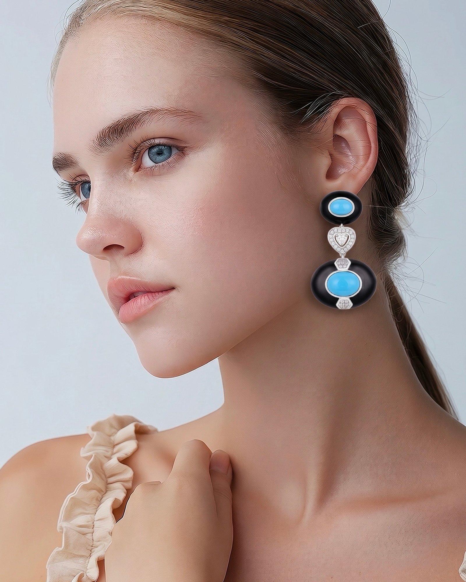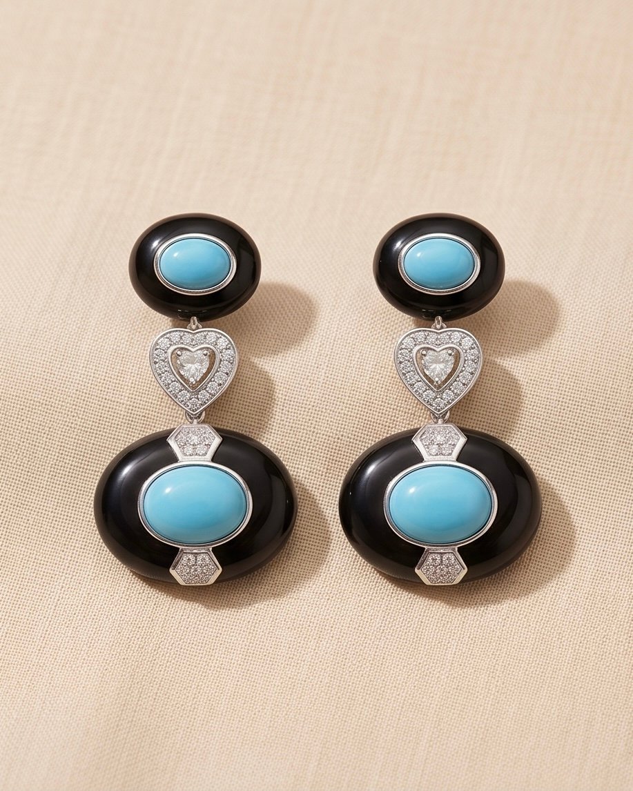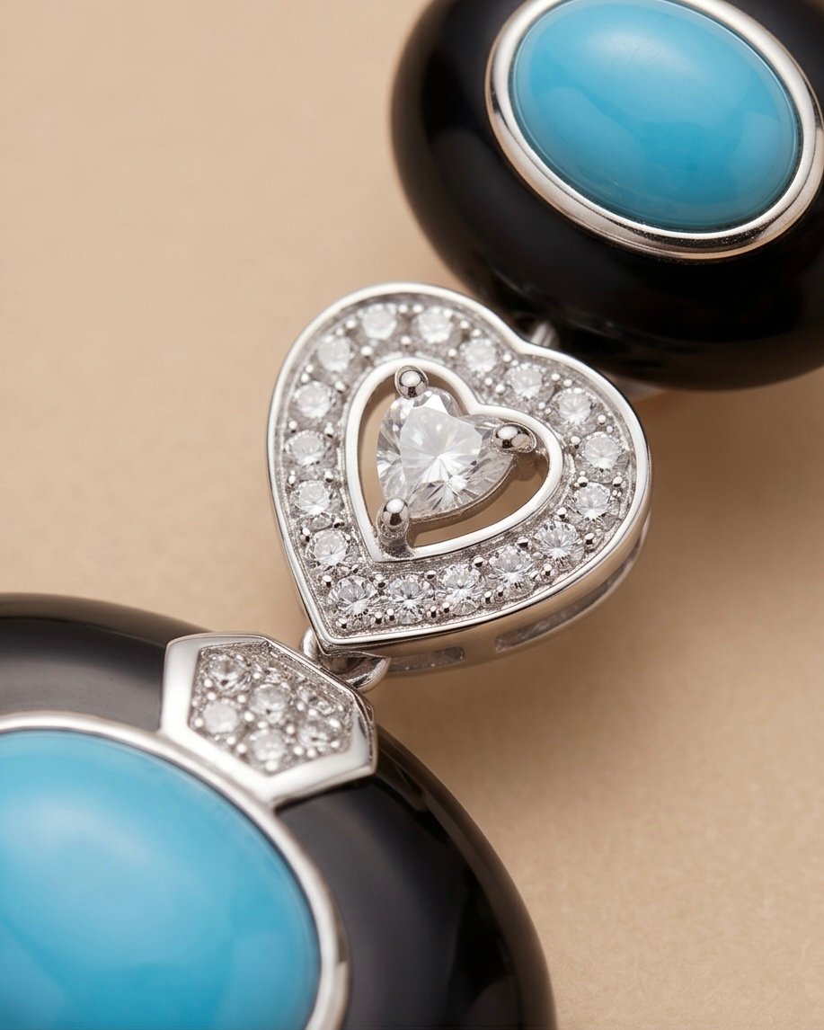 La finitura in pasta di turchese richiama i colori intensi e puri del mare, creando un affascinante contrasto con le superfici smaltate nere. Il design è arricchito da dettagli luminosi in imitazione diamante ZC A+, E, ed un luminoso zircone a cuore al centro, che riflettono la luce con estrema brillantezza, donando al gioiello un effetto prezioso e sofisticato.