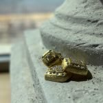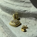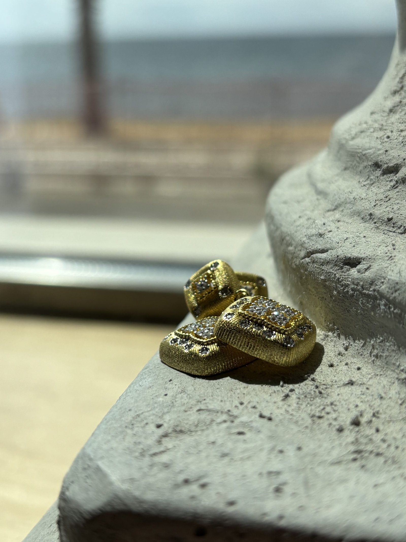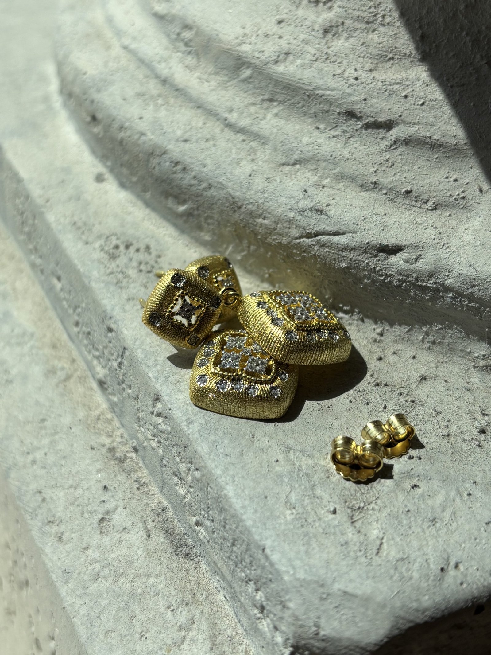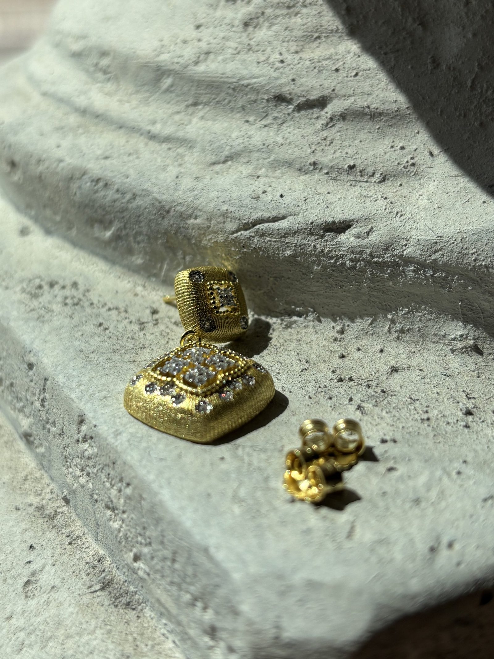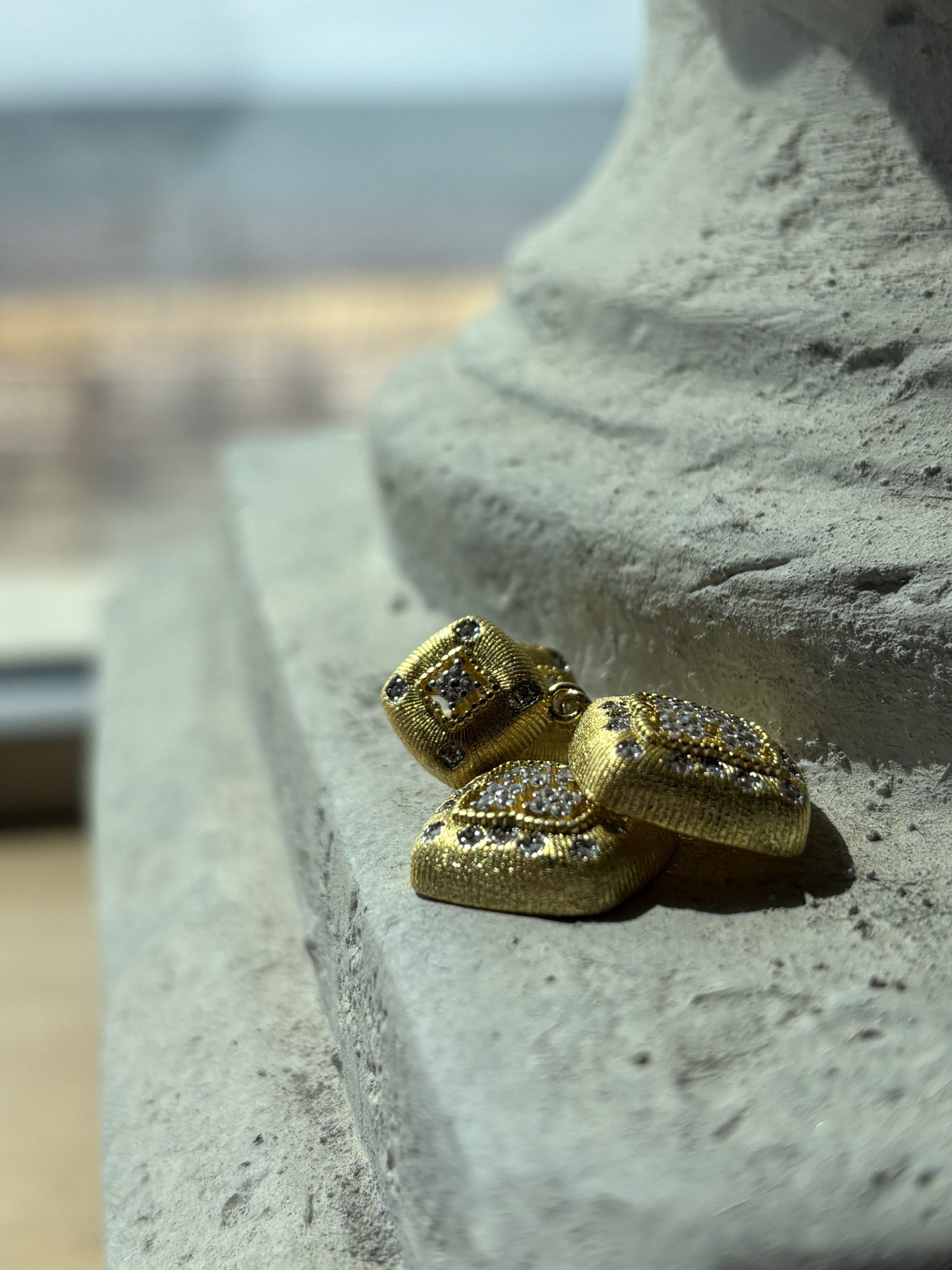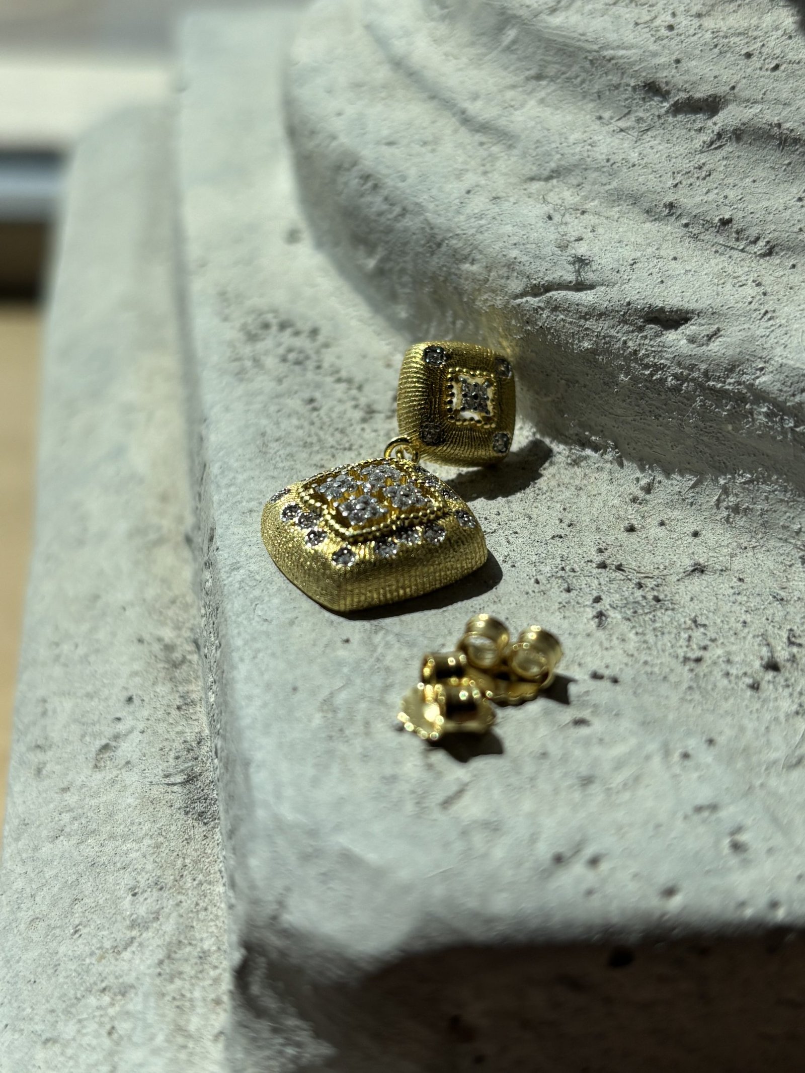 Il design quadrato, leggermente bombato e finemente lavorato a texture, è arricchito da zirconi trasparenti incastonati con precisione, che catturano la luce e donano una brillantezza senza pari.
