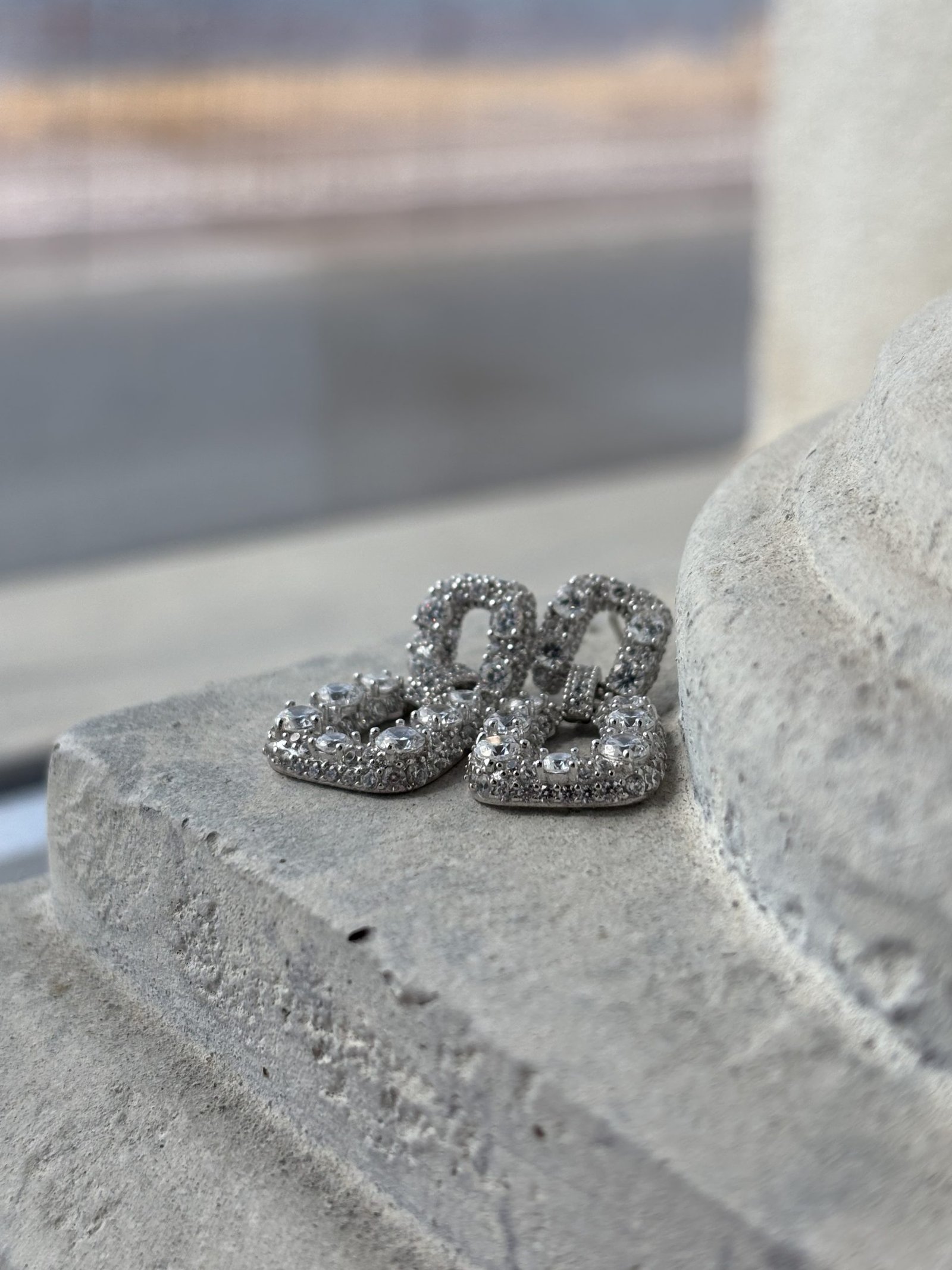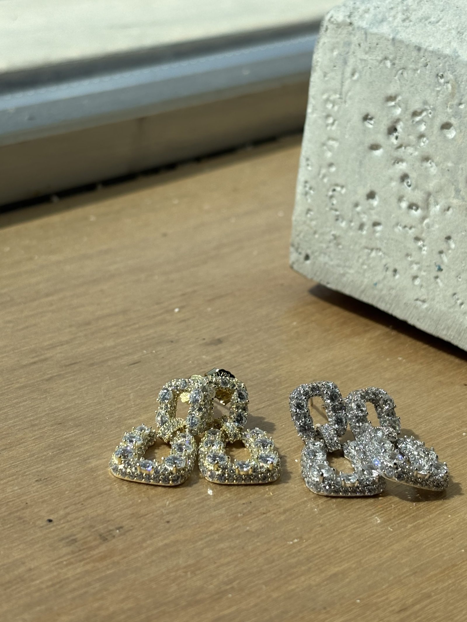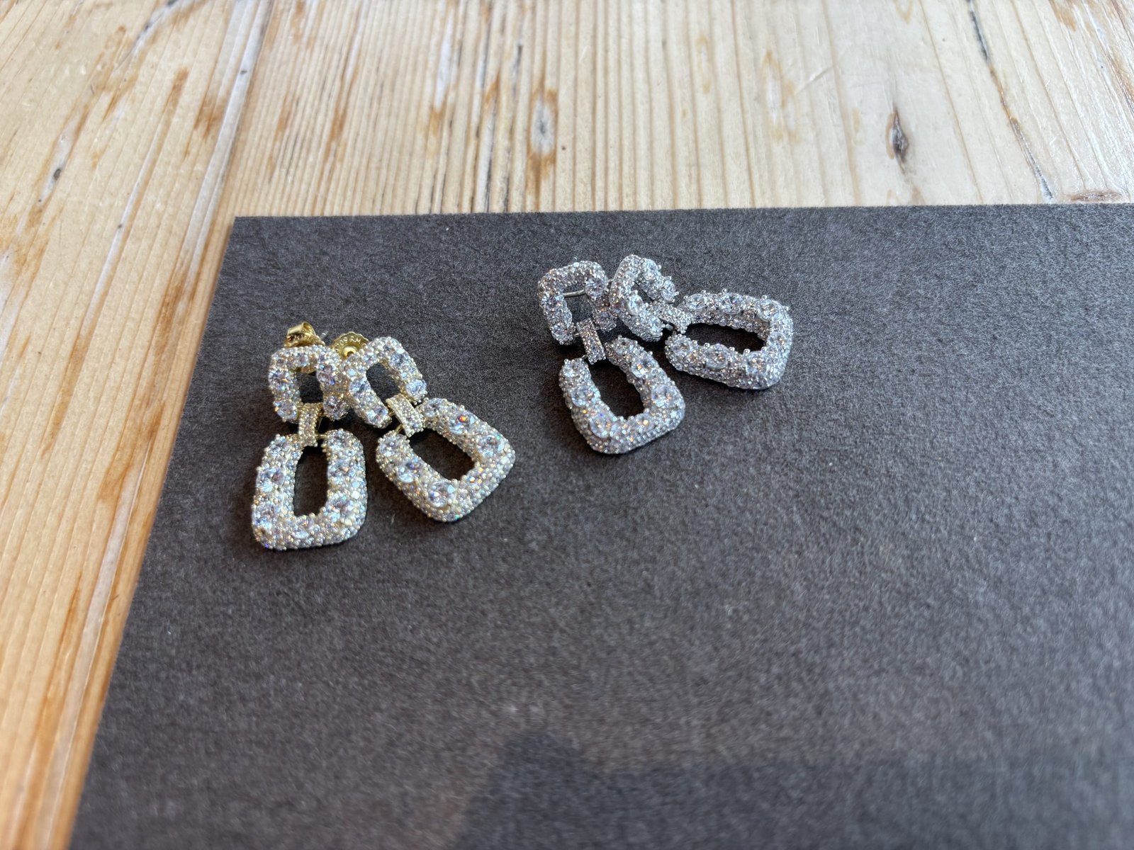 Realizzati in argento 925, questi orecchini presentano due maglie pendenti intrecciate, ricoperte di zirconi che catturano la luce e donano una brillantezza straordinaria.