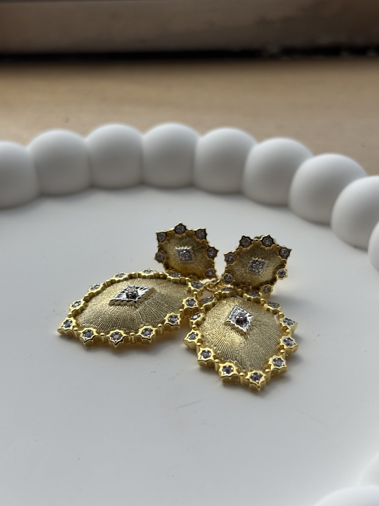 Realizzati in argento 925 con placcatura in oro 18K, questi orecchini presentano un design a doppio elemento: la parte centrale satinata si abbina perfettamente alla cornice tempestata di zirconi trasparenti, creando un bellissimo gioco di luci e riflessi.